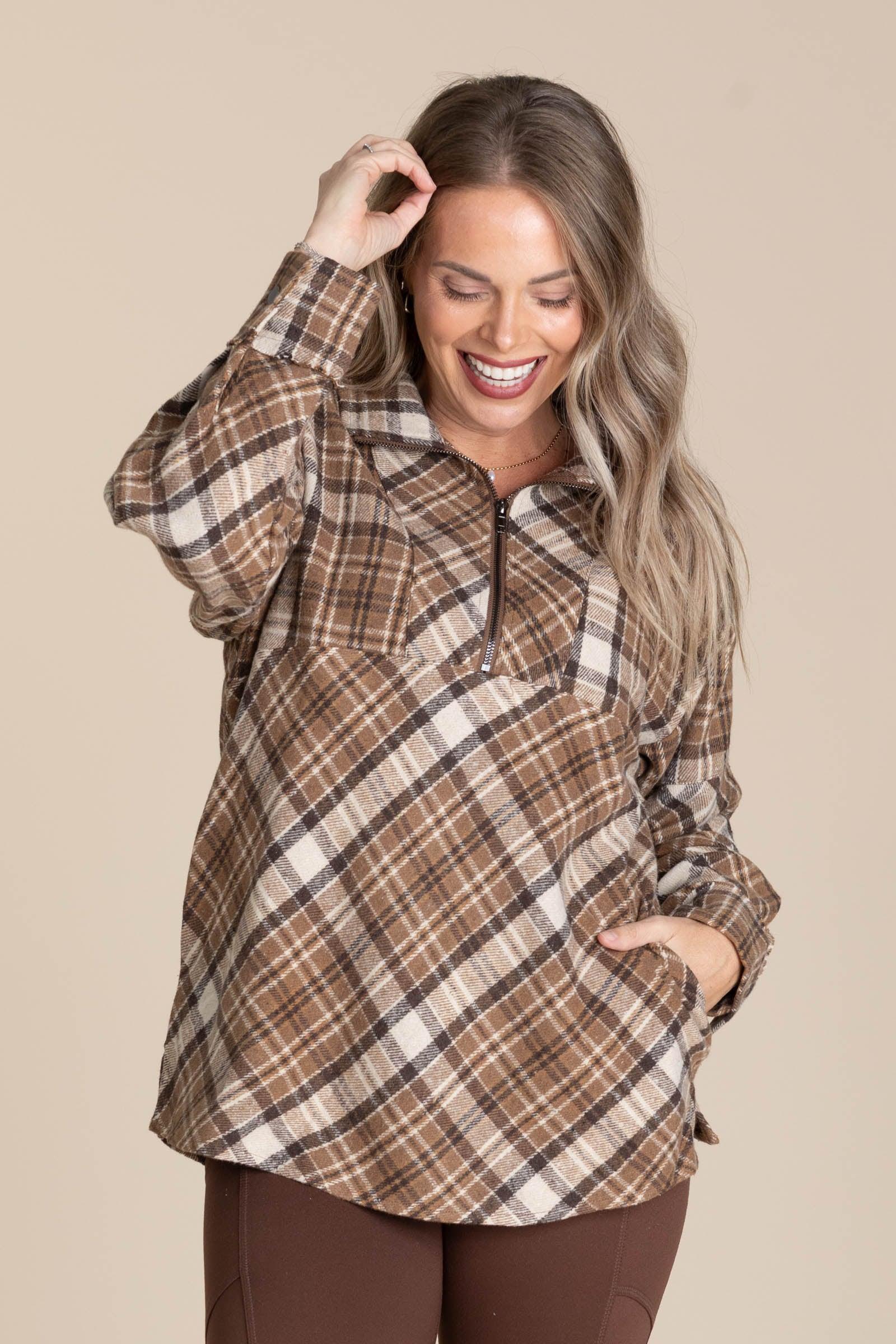 Product Details Colors: Mocha, Tan, Brown Print: Plaid Neckline: 3/4 Zip Sleeve: Long Sleeve Hemline: Round Brand: AEMI + CO Material and Care Self: 50% Cotton 50% Polyester Hand Wash Cold Hang/ Line Dry Size and Fit Small: Bust 42" Waist 40" Length 29" Medium: Bust 44" Waist 42" Length 29.5" Large: Bust 46" Waist 44" Length 30" Erica is 5’7” and wearing her true size small