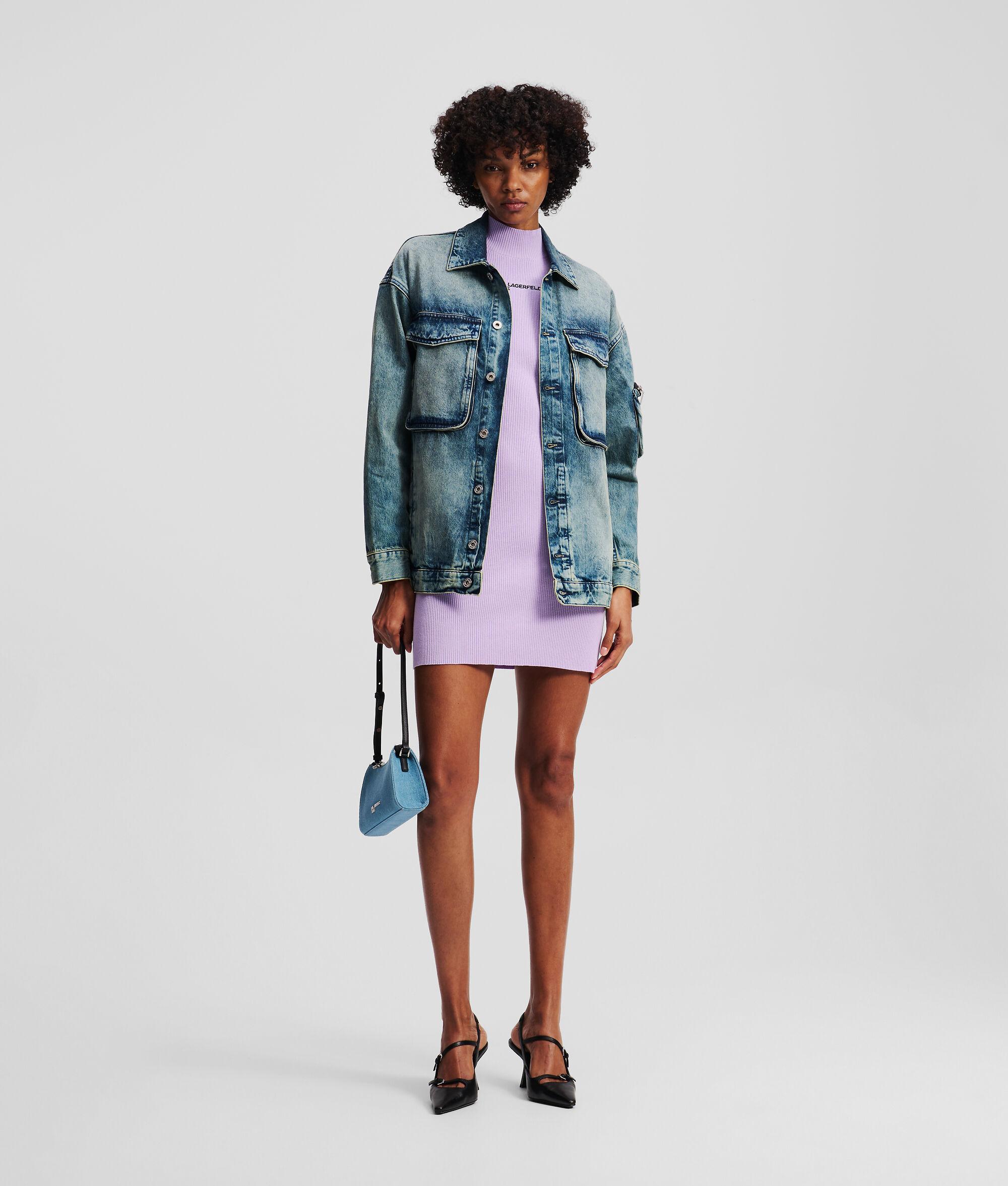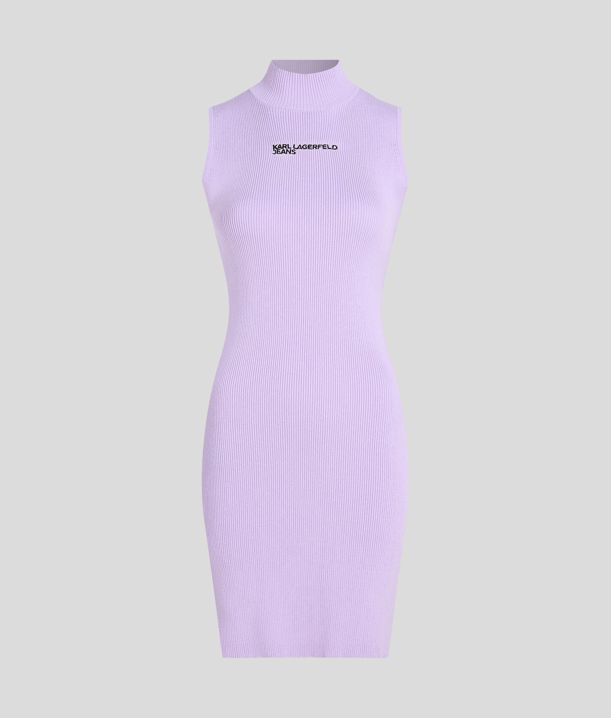 A sleeveless mock-neck silhouette defines this knitted dress. The eye-catching KARL LAGERFELD JEANS print at the chest adds a bold statement, making it an essential piece for any wardrobe.