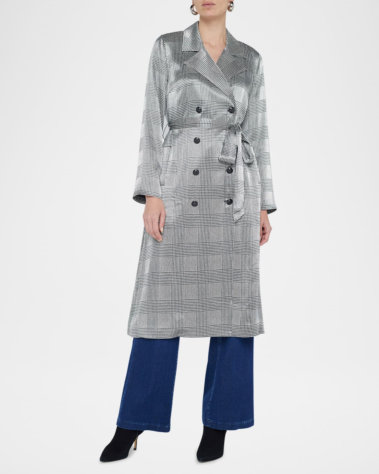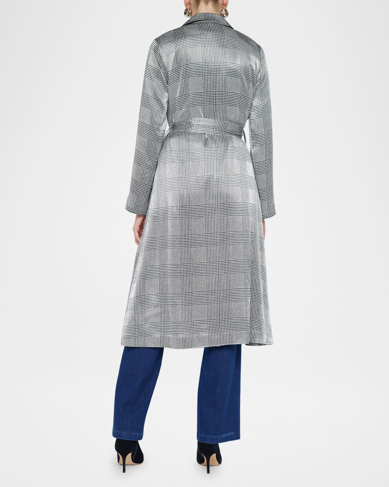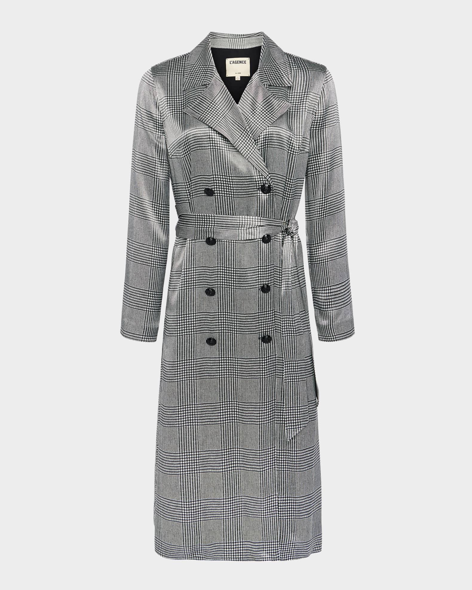 L'Agence "Moda" satin trench coat in a houndstooth plaid pattern Notched collar; double-breasted front Long sleeves Self-tie sash belt through belt loops Side-entry pockets Hem falls below the knee A-line silhouette Viscose Dry clean Imported Model is 5'10"/177cm.