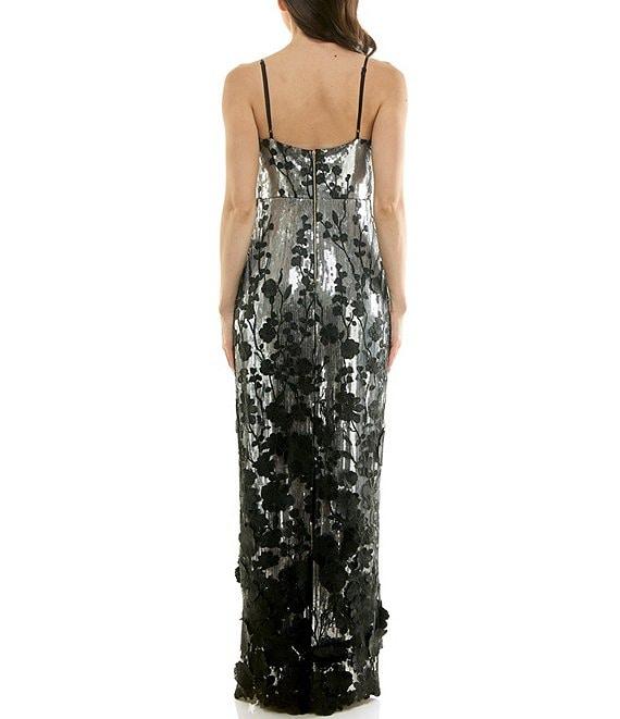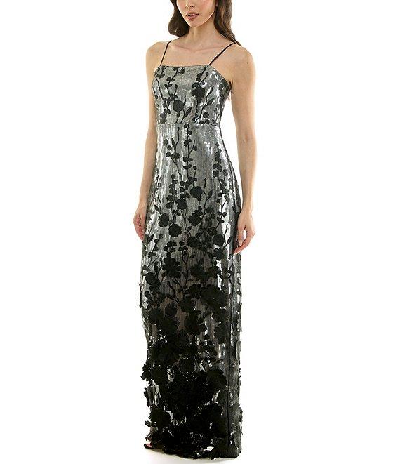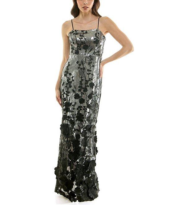 From Moda Tara, this dress features: Embroidered and sequin mesh fabrication Square neckline Sleeveless 3D flower embroidery Adjustable straps Lined Center back zipper closure Approx. 62" in length Polyester/spandex Hand wash/line dry Imported.