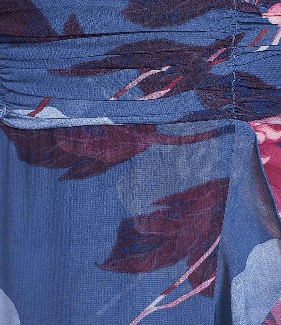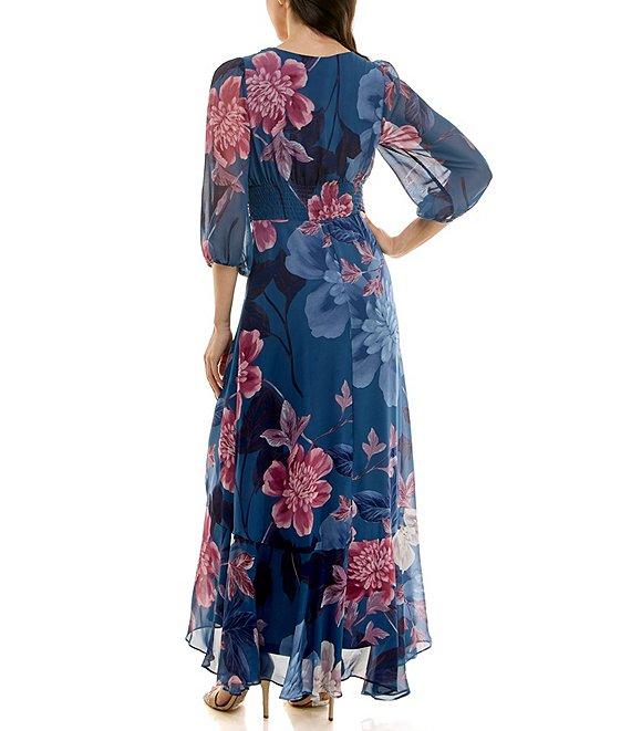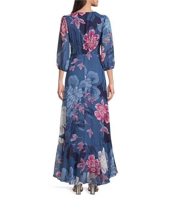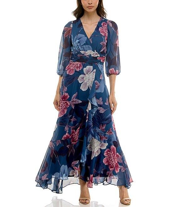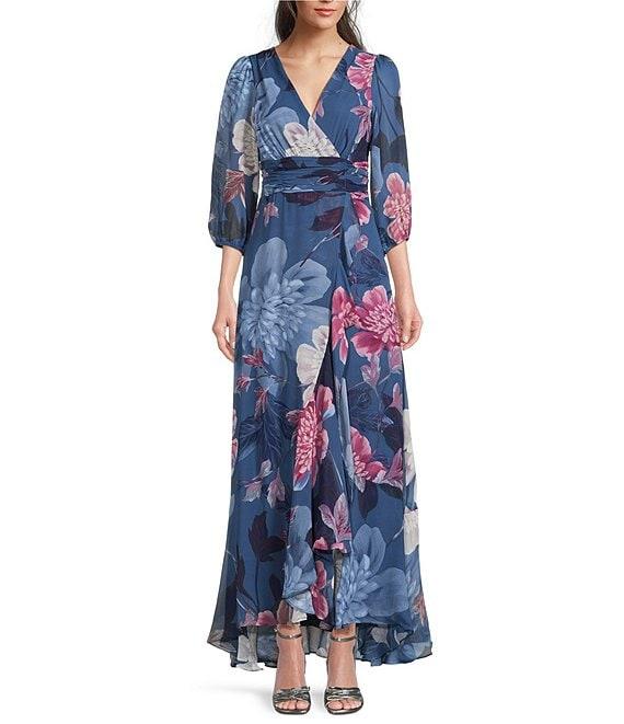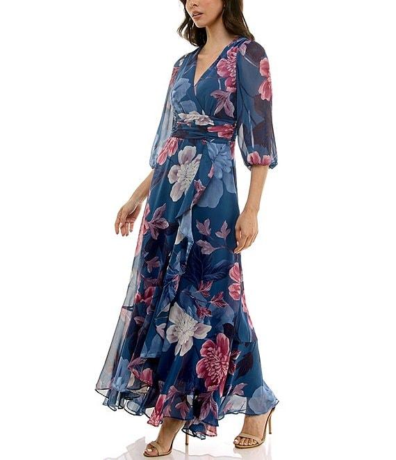 From Moda Tara, this dress features: Chiffon fabrication V-neckline 3/4 sleeves Wrap silhouette Lined Smocked back waist Ruffled skirt Floral print Zip back closure Approx. 57.5" in length from high point shoulder Polyester Hand wash / dry flat Imported.