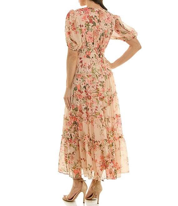 Moda Tara Floral Print Stripe Chiffon Ruffle V-Neck Short Sleeve Tiered Midi Dress