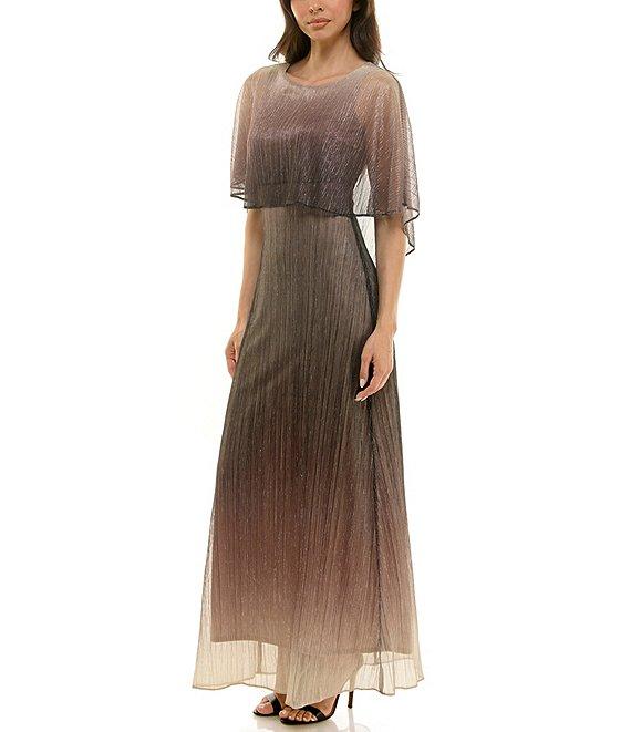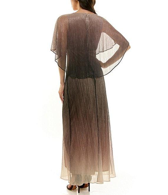 From Moda Tara, this dress features: Crinkle lurex mesh fabrication Round neckline Short capelet sleeves Ombre print Lined Center back zipper closure Approx. 58.25" in length from high point shoulder Polyester/metallic Hand wash/line dry Imported.