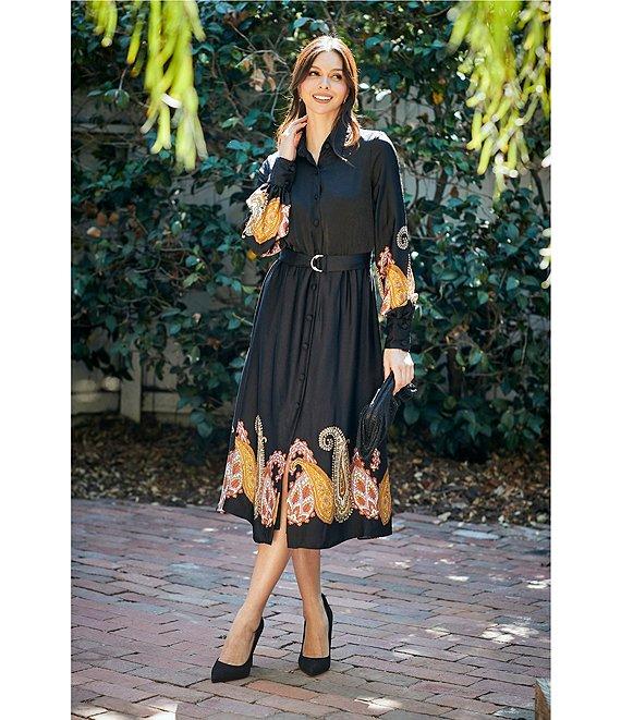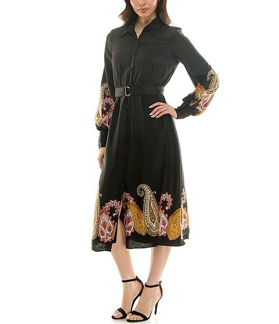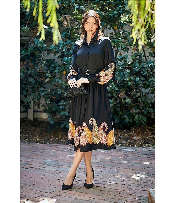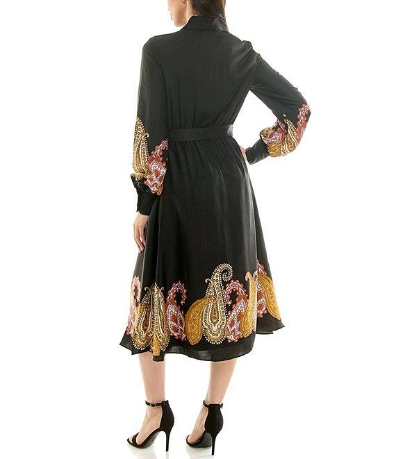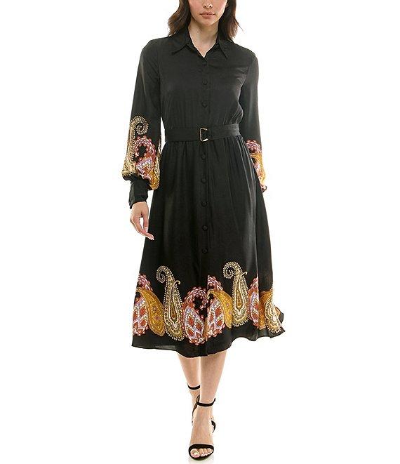 From Moda Tara, this dress features: Printed satin fabrication Point collar v-neckline Long sleeves Wrist cuff detail Paisley print Fully lined Self belt Midi dress Center front button closure Approx. 47" in length from high point shoulder Polyester Hand wash/line dry Imported.