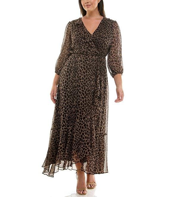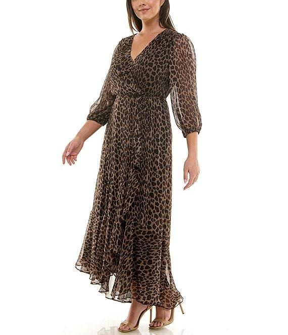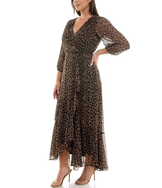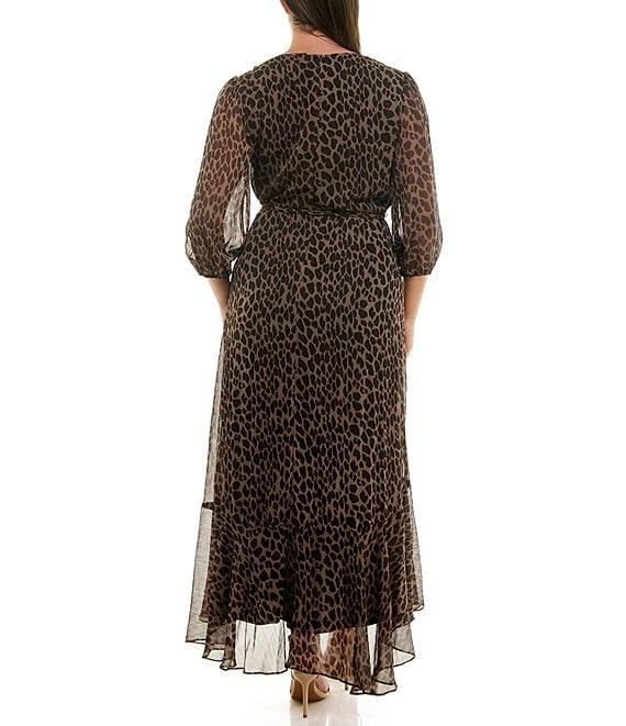 From Moda Tara Plus, this dress features: Yoryu chiffon fabrication Surplice v-neckline 3/4 bubble sleeves Leopard print Faux wrap silhouette Ruffle high low hem Spaghetti strap belt Fully lined Center back zipper closure Approx. 58.75" in length from high point shoulder Polyester Hand wash/line dry Imported.