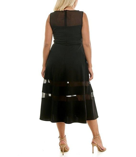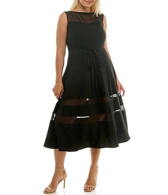 From Moda Tara Plus, this dress features: Stretch crepe fabrication Round neckline Sleeveless Fit and flare silhouette Midi dress Illusion chiffon Spaghetti strap belt Partially lined Center back zipper closure Approx. 52.5" in length from high point shoulder Polyester/spandex Hand wash/line dry Imported.