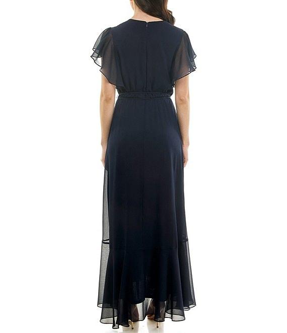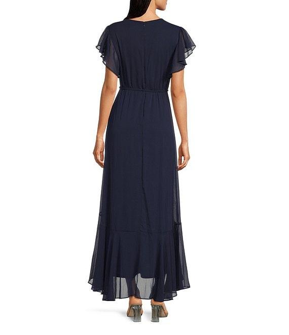 From Moda Tara, this dress features: Chiffon fabrication V-neckline Short ruffled sleeves Wrap silhouette Lined Belt Ruffled hem Zip back closure Approx. 57.25" in length from high point shoulder Polyester Hand wash Imported.