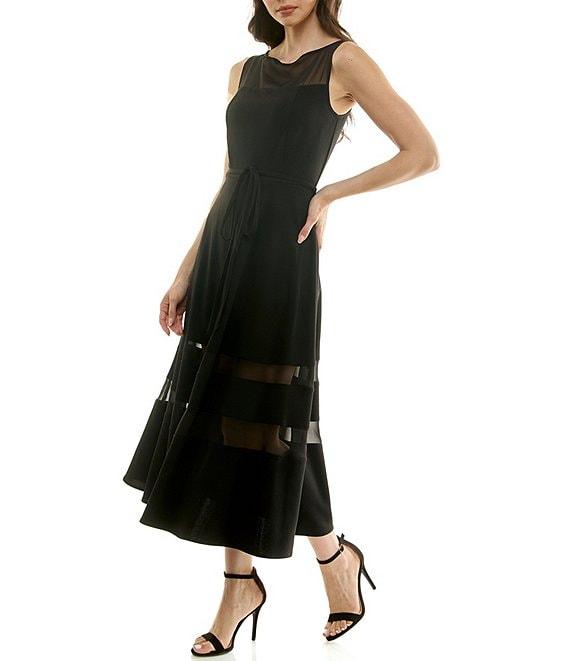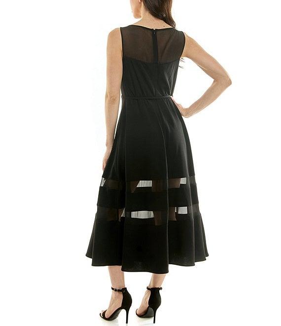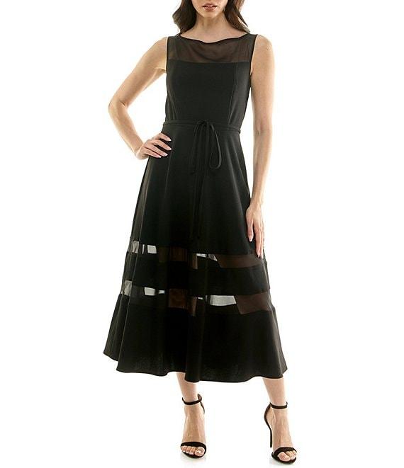From Moda Tara, this dress features: Stretch crepe fabrication Round neckline Sleeveless Fit and flare silhouette Midi dress Illusion chiffon Spaghetti strap belt Partially lined Center back zipper closure Approx. 49" in length from high point shoulder Polyester/spandex Hand wash/line dry Imported.