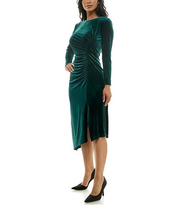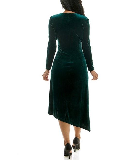 From Moda Tara, this dress features: Stretch velvet fabrication Crew neckline Long sleeves Asymmetrical hem Midi dress Side slit Side ruching bodice Center back zipper closure Approx. 48" in length Polyester/spandex Machine wash/dry flat Imported.