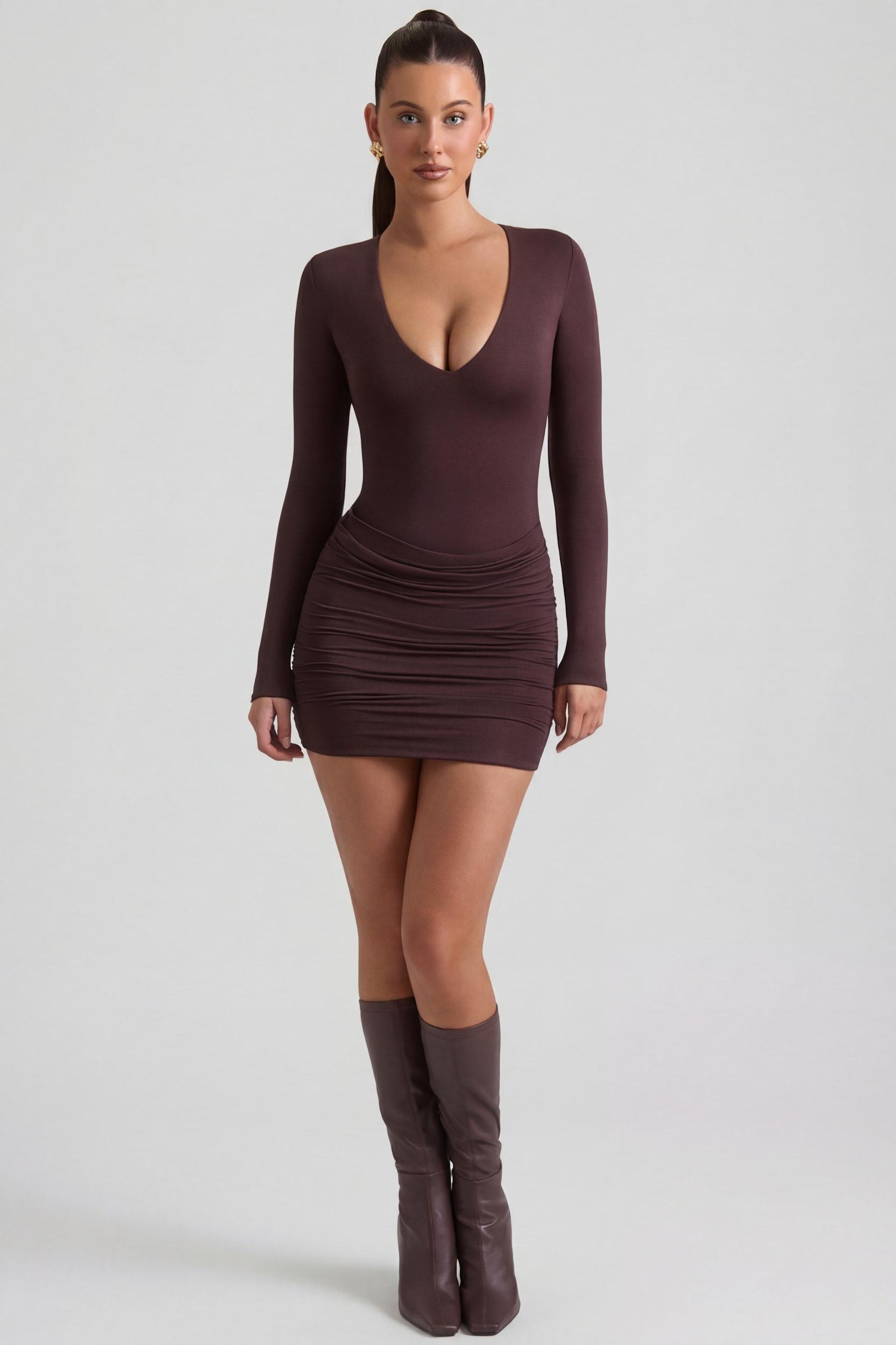 Made to feel as good as it looks, the Eilise mini dress is crafted from our luxe modal-cashmere blend that features temperature-regulating properties for enhanced warmth and cloud-like softness. It’s cut to a figure-defining bodycon silhouette with a fitted bodysuit and draped mini skirt overlay, elevated with perfectly placed ruching. Plunge V-neckLong fitted sleevesFitted bodysuitDraped, ruched mini skirtPull-on designPopper fastenings at baseBodycon silhouetteMini length, SNP to hem approx. 82cm based on a size SProduct code: 13520