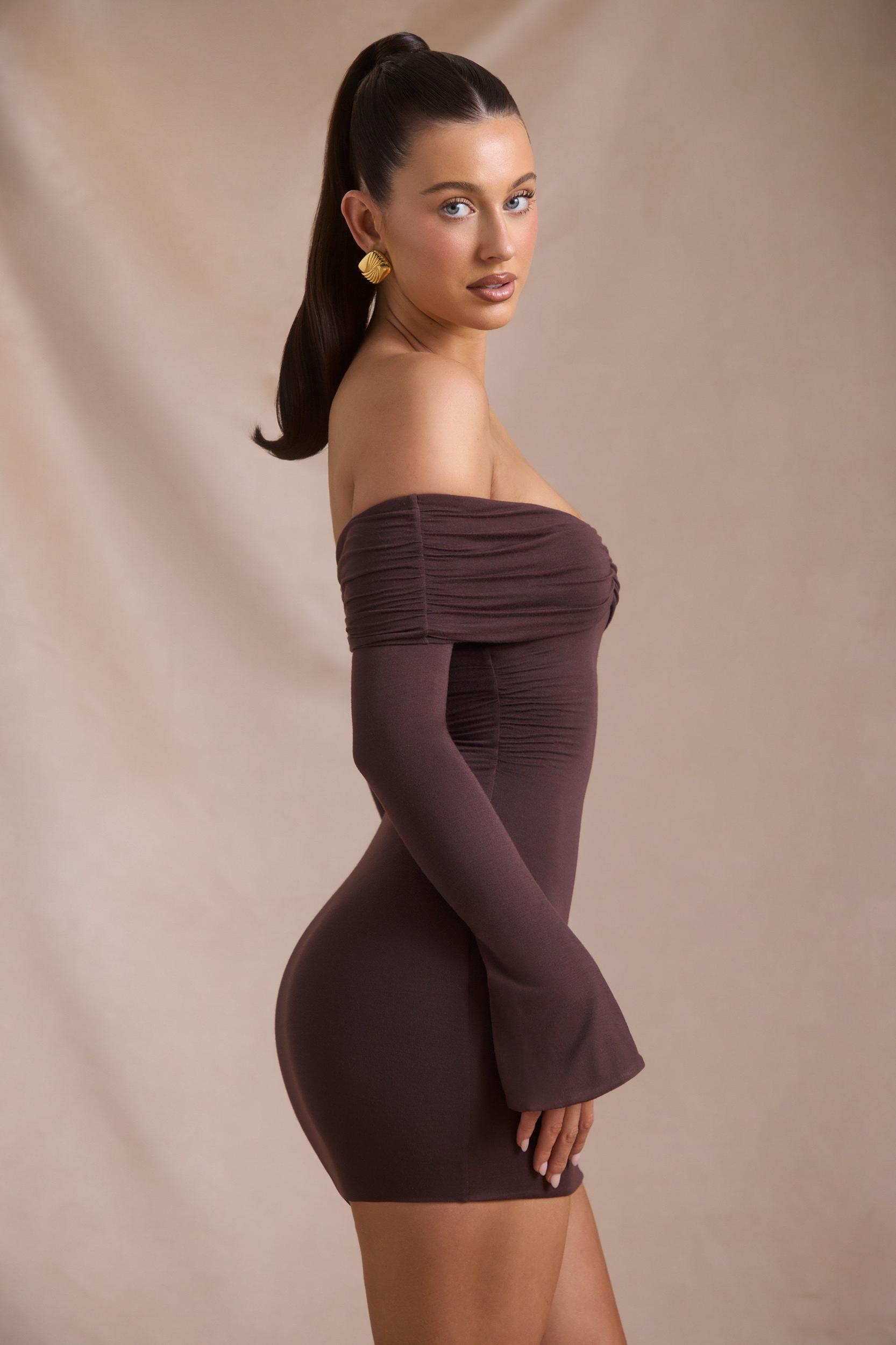 Effortless styling, everyday luxury. Made from premium and super soft modal-cashmere blend, the Thais mini dress is a staple you’ll reach for year-round, with temperature-regulating properties and a plush, cloud-like texture. It’s framed with off-shoulder flared sleeves, cut to a figure-defining bodycon silhouette and features a foldover sweetheart neckline with precise ruching. Foldover sweetheart neckOff-shoulder long flared sleevesRuched detailingPull-on designBodycon silhouetteMini length, SNP to hem approx. 82cm based on a size SProduct code: 13149