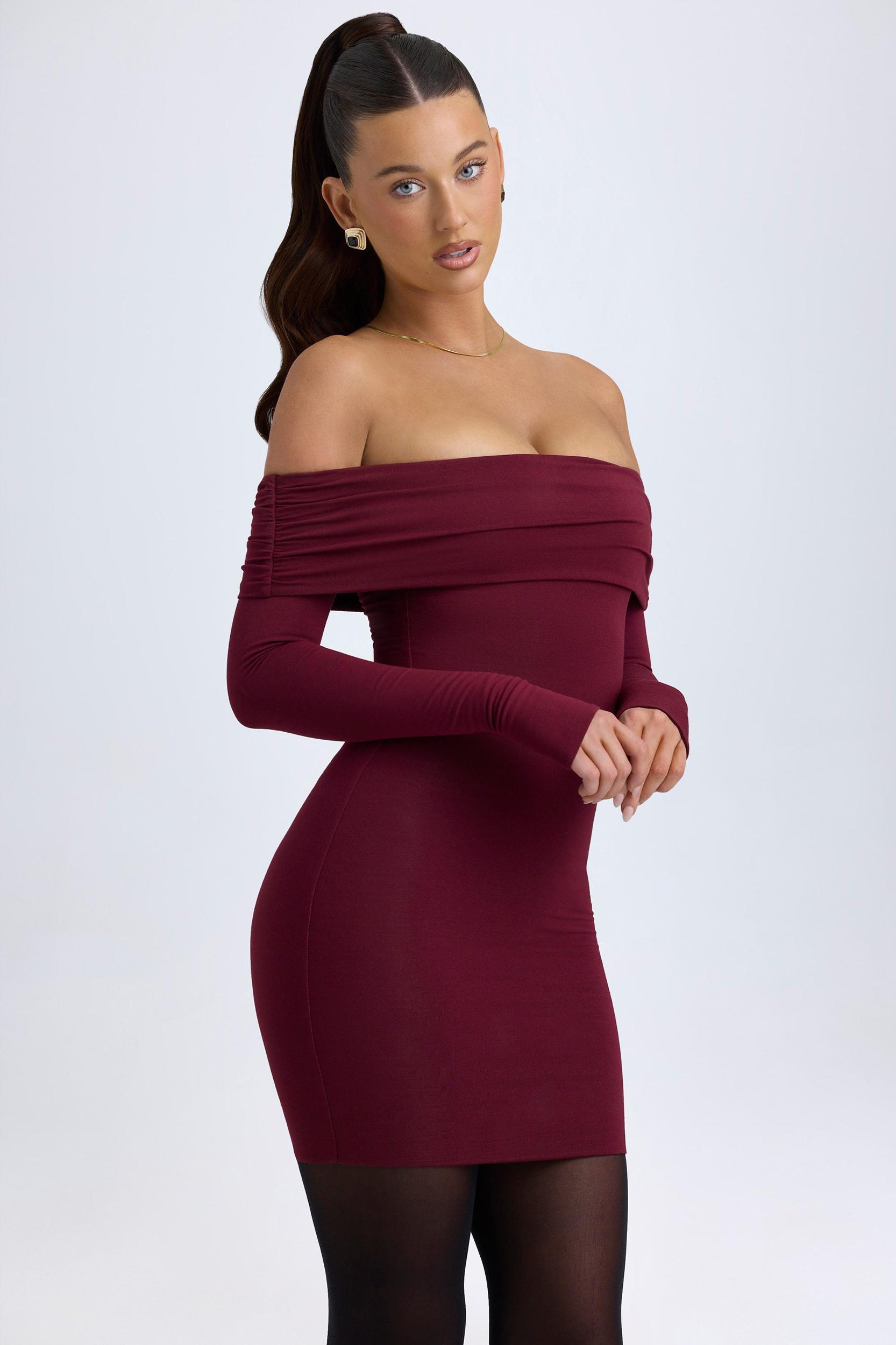 Statement staples. A style made for day-to-night plans, the Oriana mini dress is cut to an off-shoulder silhouette with a foldover ruched neckline. It features internal silicone tape for enhanced support, is framed with long fitted sleeves and crafted from our buttery soft and stretchy jersey made with TENCEL™ Modal fibres, derived from controlled or certified wood sources. Ruched foldover bandeau neck Off-shoulder long sleeves Internal silicone tape for enhanced hold Ruched detailing Pull-on design Bodycon silhouette Mini length, SNP to hem approx. 82cm based on a size S Product code: 12231