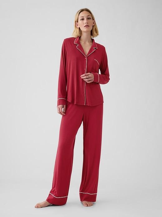 Made with 89% LENZING™ Modal™ , a wood-based fiber produced from trees harvested from sustainable forests where 99% of the raw material comes from certified or controlled sources. LENZING™ and TENCEL™ are trademarks of Lenzing AG. Soft stretch sleep shirt. Notch lapel collar. Long sleeves. Button front. Piping detail allover. This product was made in a factory that runs the Gap Inc. P.A.C.E. (Personal Advancement & Career Enhancement) program. P.A.C.E. is our educational program that helps the women who make our clothes build the skills, knowledge, confidence & resilience needed to advance in work & life. Learn more here. #663803