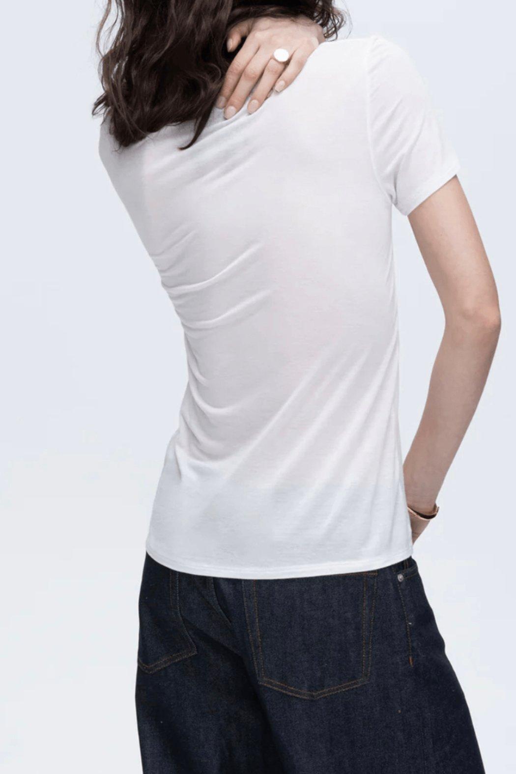 This tee is composed of 100% Modal. Made in Peru. Hand Wash Cold Recommended or Machine Wash Cold in Mesh Bag. Gentle Cycle. Do Not Bleach. Lay flat to dry. Cool Iron if needed.