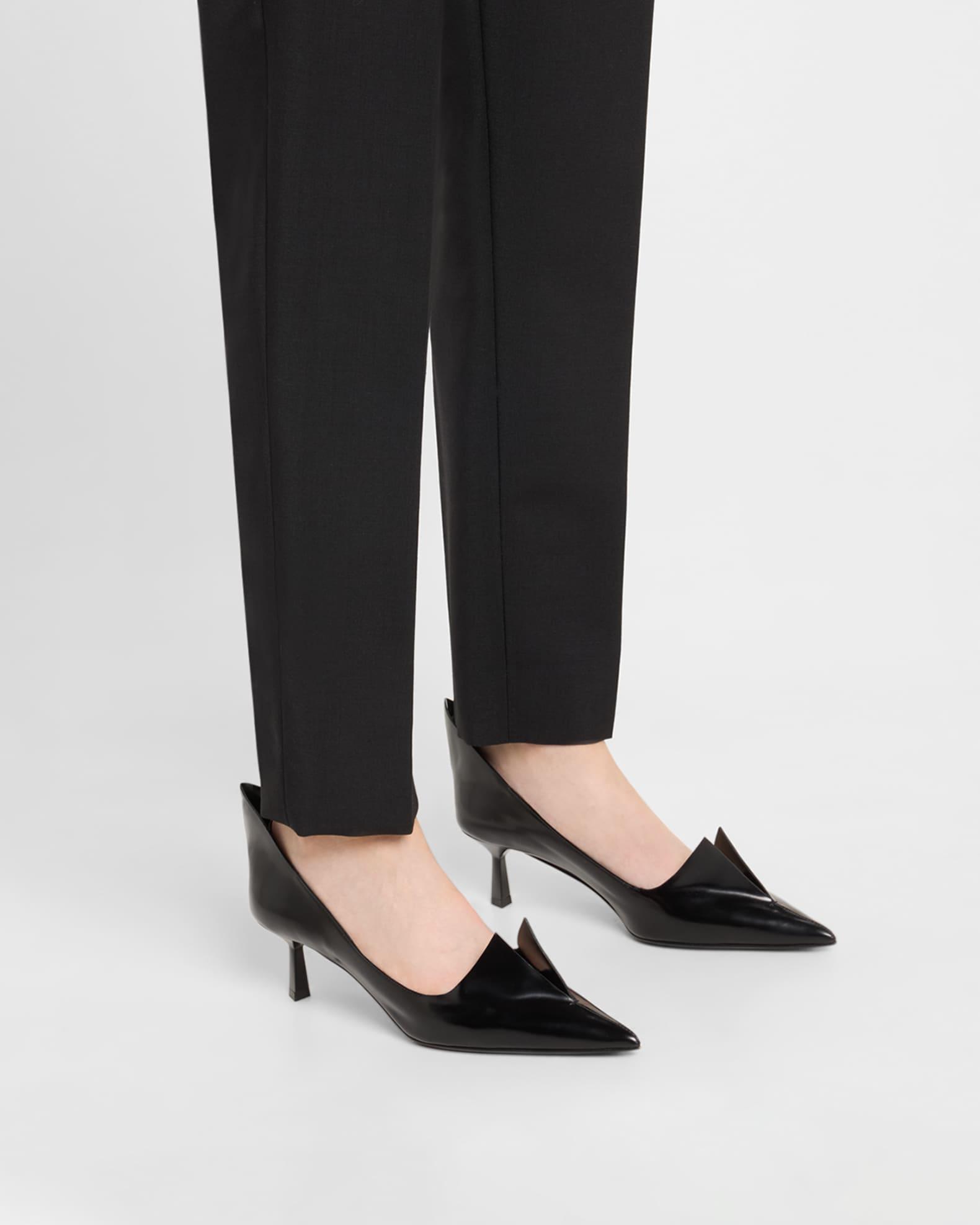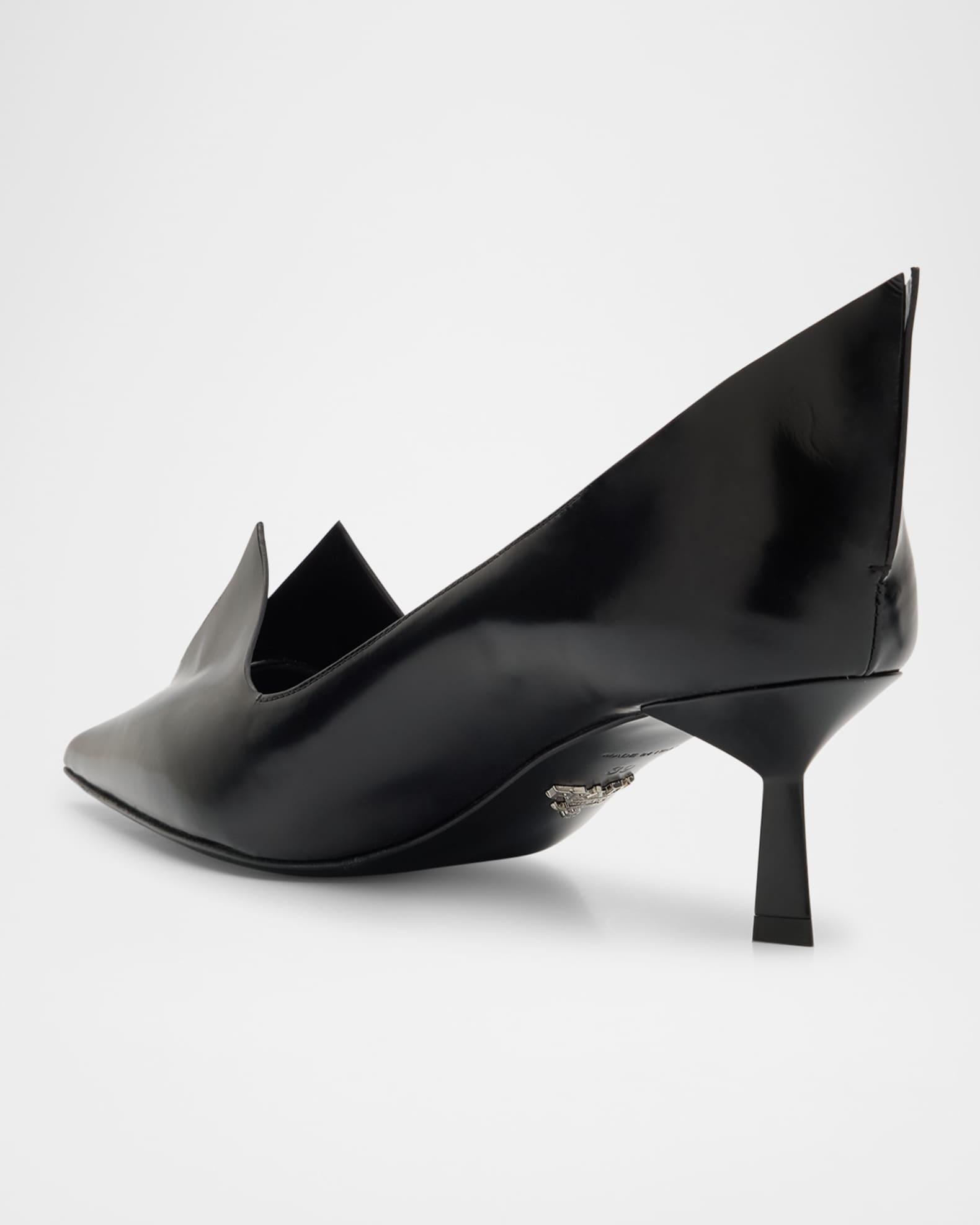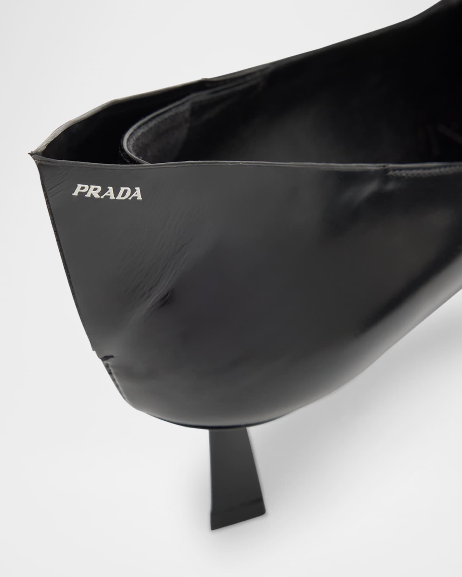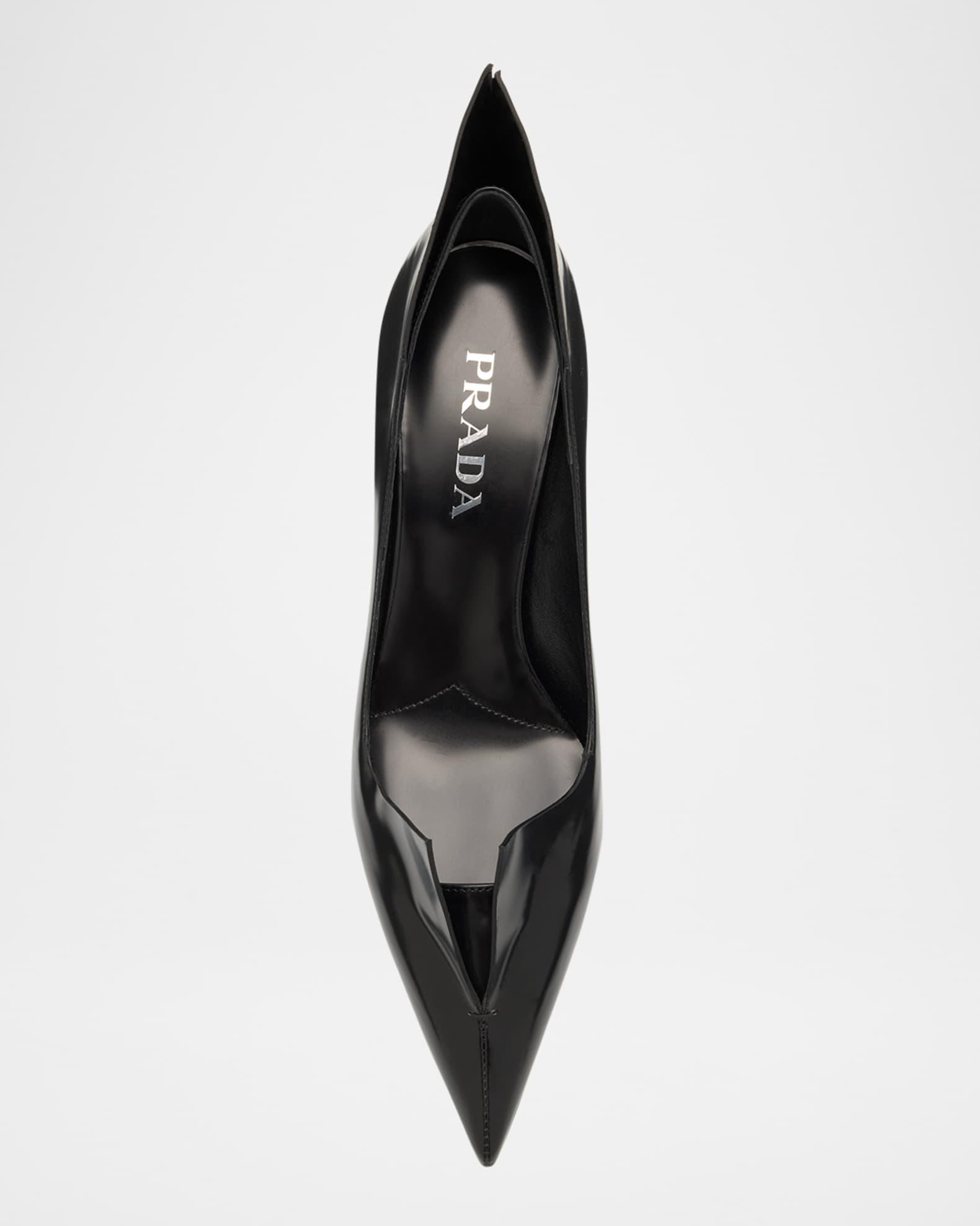 Prada "Modellerie" pumps in brushed calf leather with spiked detailing on the vamp and backstay 2.25 in / 55 mm stiletto heel Pointed toe V-cut vamp Unlined Logo lettering on the side Leather outsole Made in Italy Size Note: Runs true to size.