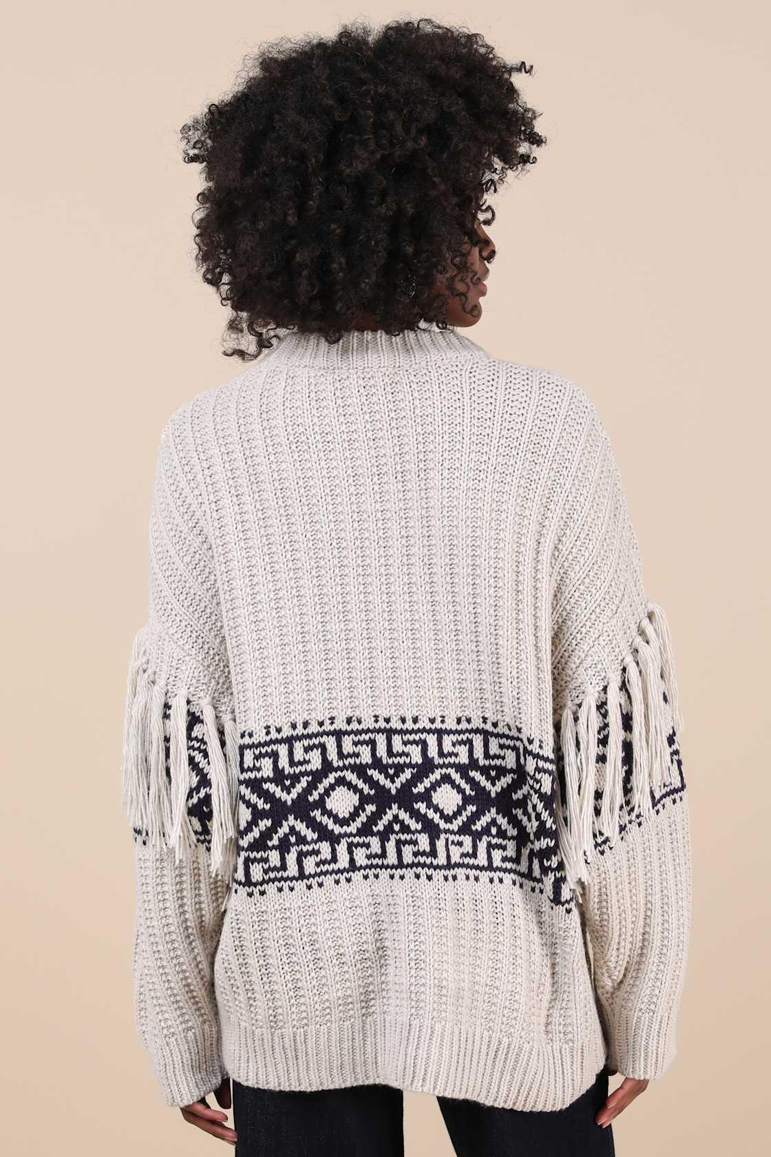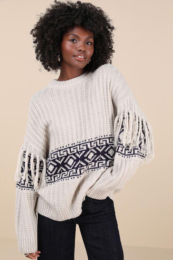 A must-have piece like the Lulus Modern Coziness Light Grey Fair Isle Fringe Oversized Sweater will become a fast favorite in your winter wardrobe! This classically comfy sweater has a medium-gauge knit composition that boasts a mix of timeless and trendy details, including a navy blue Fair Isle-inspired pattern that adorns the front and back of the pullover silhouette and fringe trim that accents the long sleeves with drop shoulders. A crew neckline and oversized bodice complete the look. Contrasting ribbed knit at the neckline, cuffs, and hem.