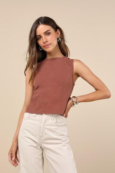 You'll be the envy of all your besties in a cute look like the Lulus Modern Inclination Brown Linen Backless Tank Top! Lightweight woven linen-cotton blend fabric shapes this chic little top that has a sleeveless bodice with princess seams and a fitted silhouette. Arched, open-back cutout secures with a button closure at top and a cinching strap across the lower back.
