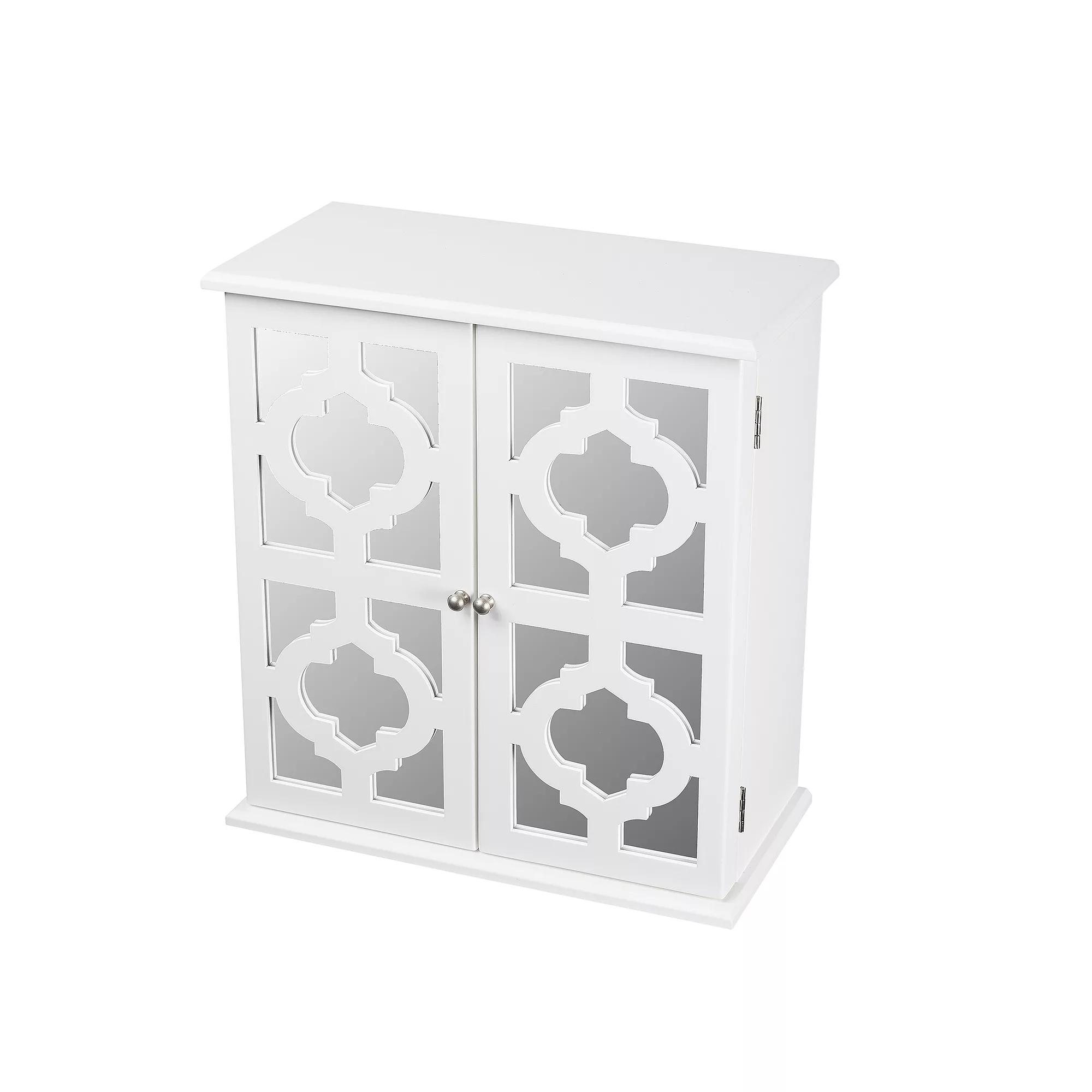 Store your accessories in style with this modern mirrored door jewelry box. Store your accessories in style with this modern mirrored door jewelry box. Dimensions: 13 in. x 12 in. x 6 in. Finish: white Glass front double door with modern design Drawers: 3 Necklace hooks: 6 Ring holder Wood composite Size: One Size. Gender: female. Age Group: adult.