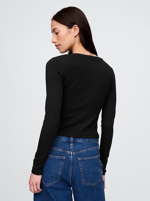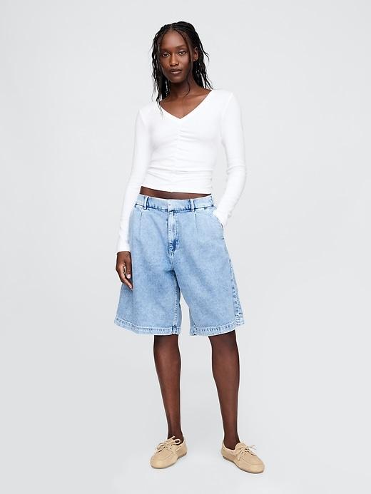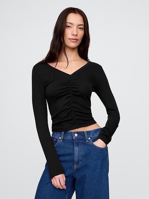 Soft, stretch cotton-modal blend T-shirt. V-neck. Long sleeves. Ruched detail at front. #787458