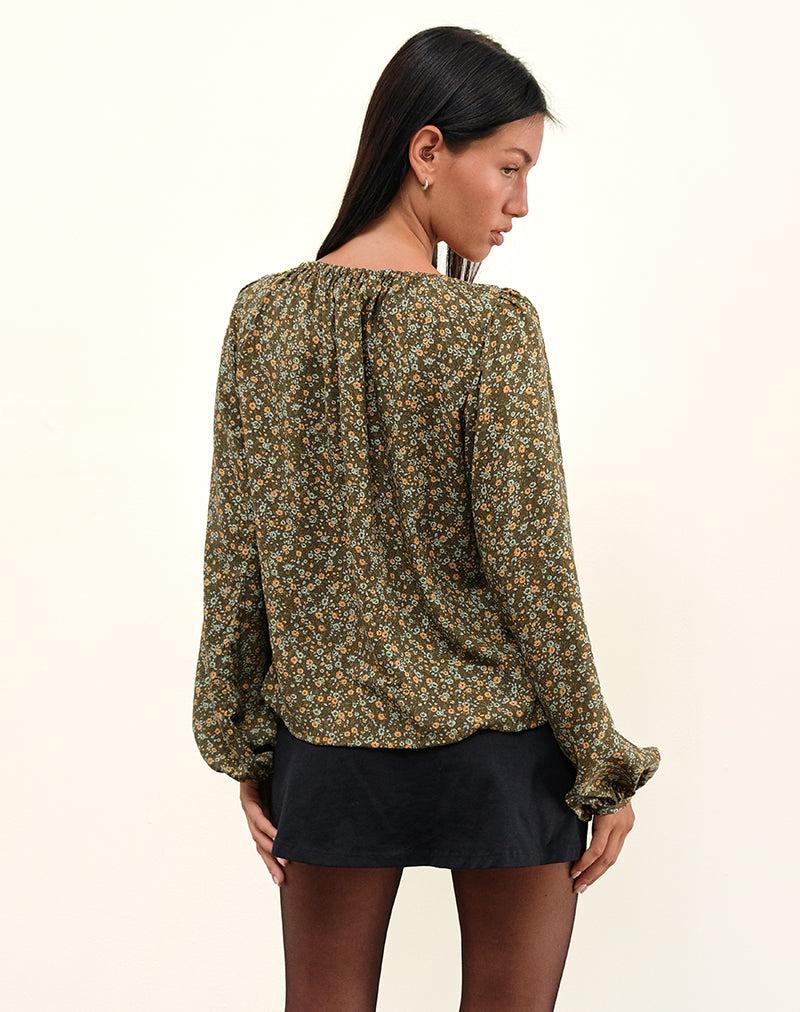 Our Modeta top features a loose regular fit, crew neckline, long sleeves and tie up front detailing. Complete in a khaki green floral grunge woven fabric. We have styled ours with our Nidya mini skirt. MODEL WEARS SIZE: EXTRA SMALL - MODEL HEIGHT:5'7