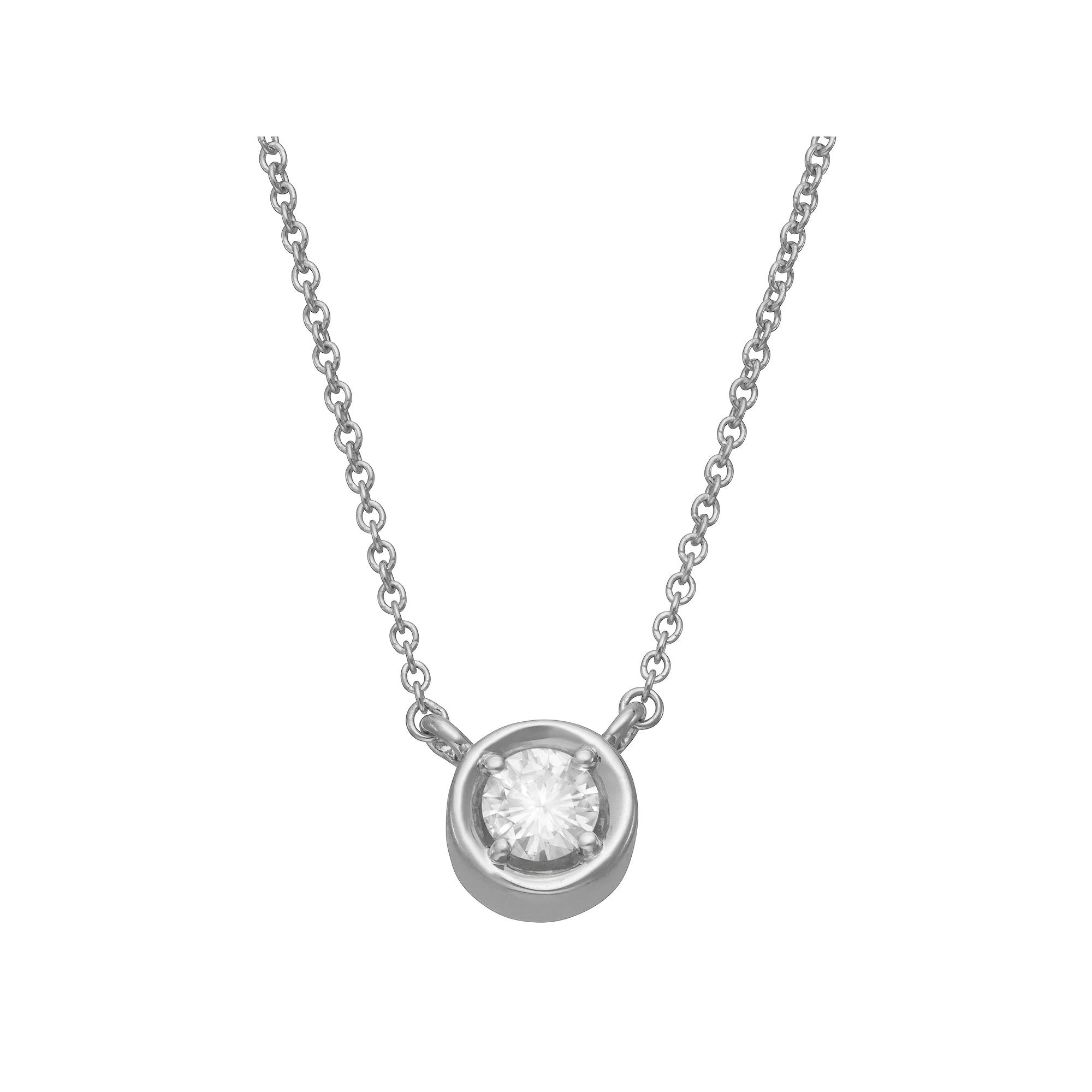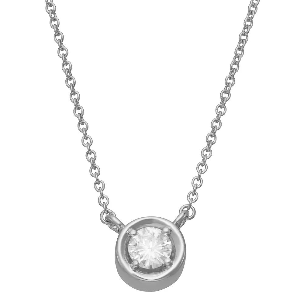 Highlighting one solitaire shining moissanite gem, this magnificent round necklace weighs in at 0.33 diamond equivalent carats and is secured in a sterling silver four-prong setting. This necklace features a cable chain and a secure lobster claw clasp. | Charles & Colvard Lab Created Sterling Silver 0.33Ct. Tw. Moissanite Solitaire Pendant, White