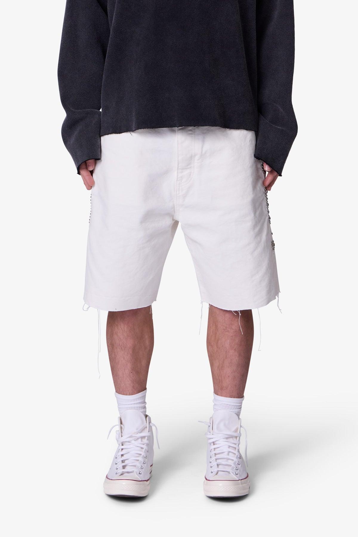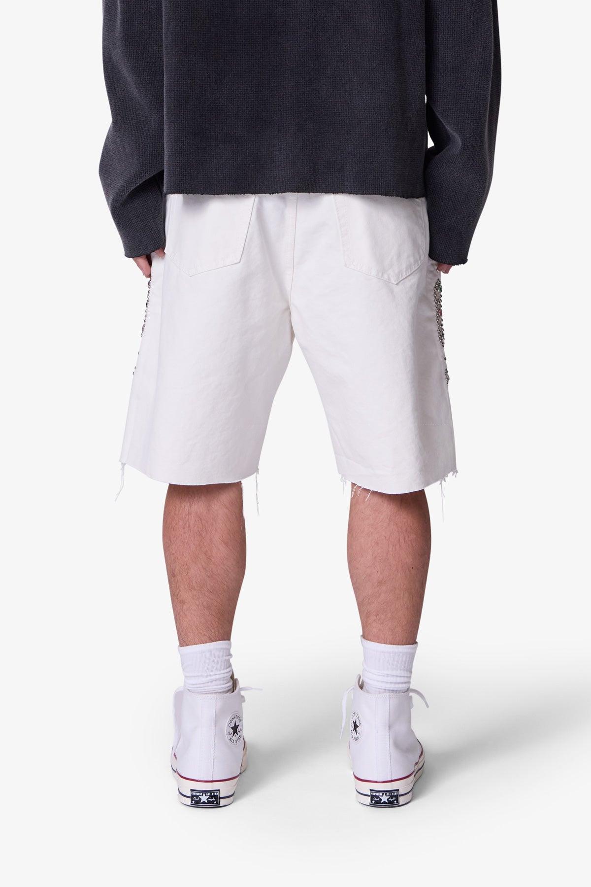 the Mojave Canvas Shorts are designed with a relaxed fit throughout, featuring traditional five pocket denim details, raw hem at the leg opening, and finished with stud and jewel details along the outseam. relaxed fit 84% cotton 16% polyester model is 6’1, 140 lbs and wears a size medium washing instructions: due to th