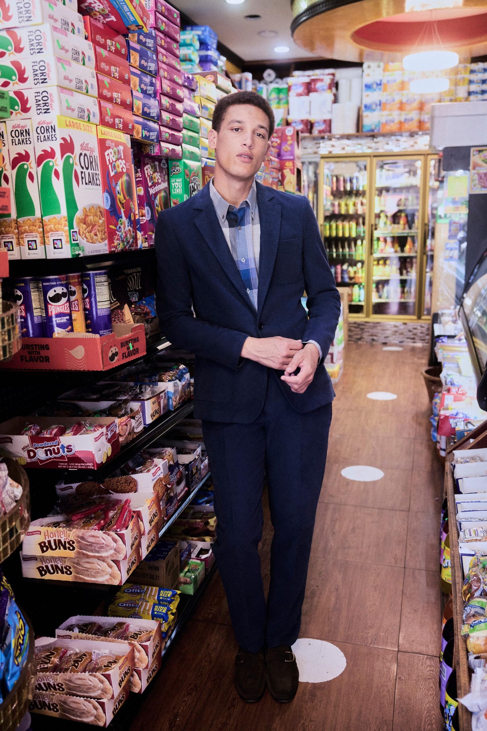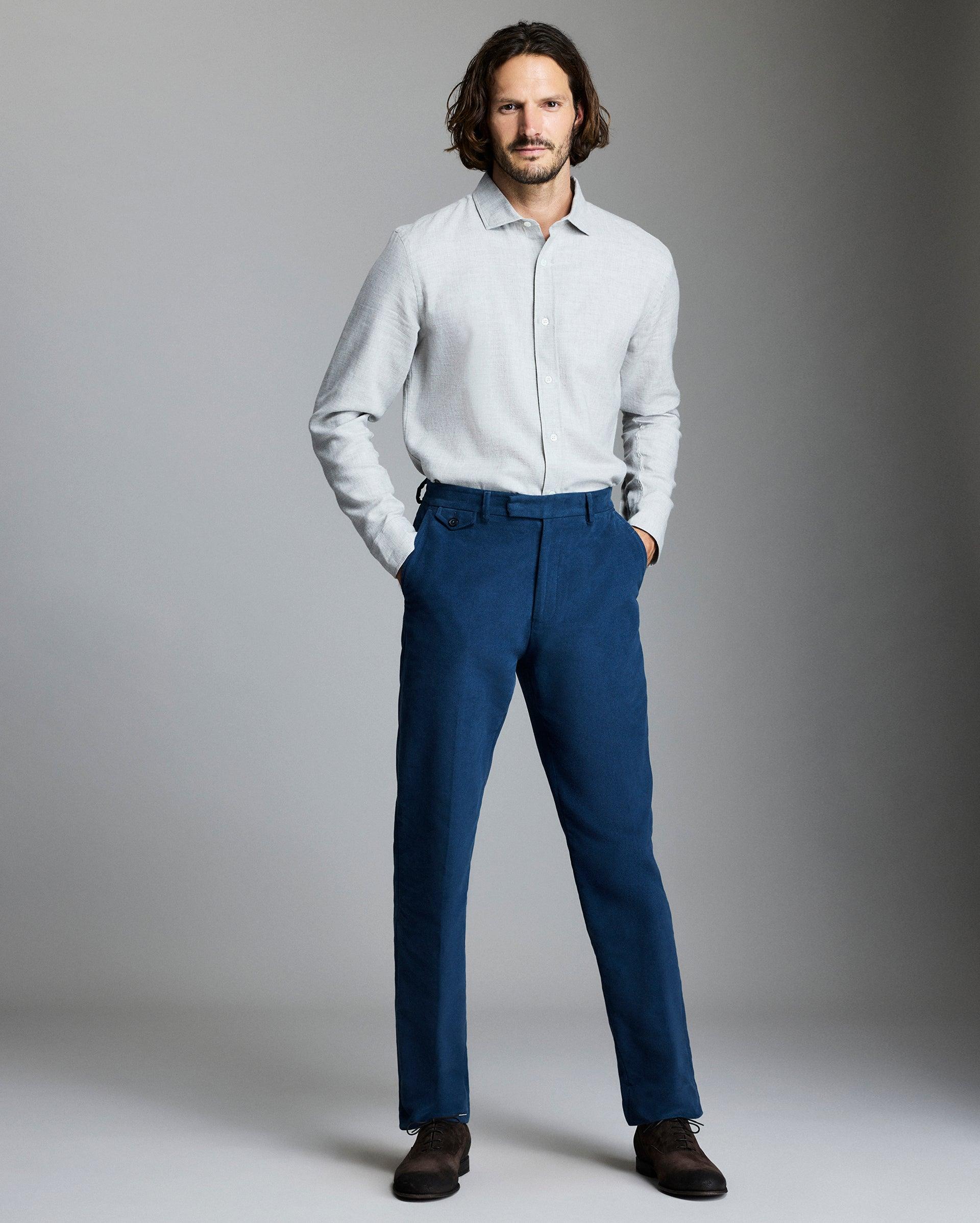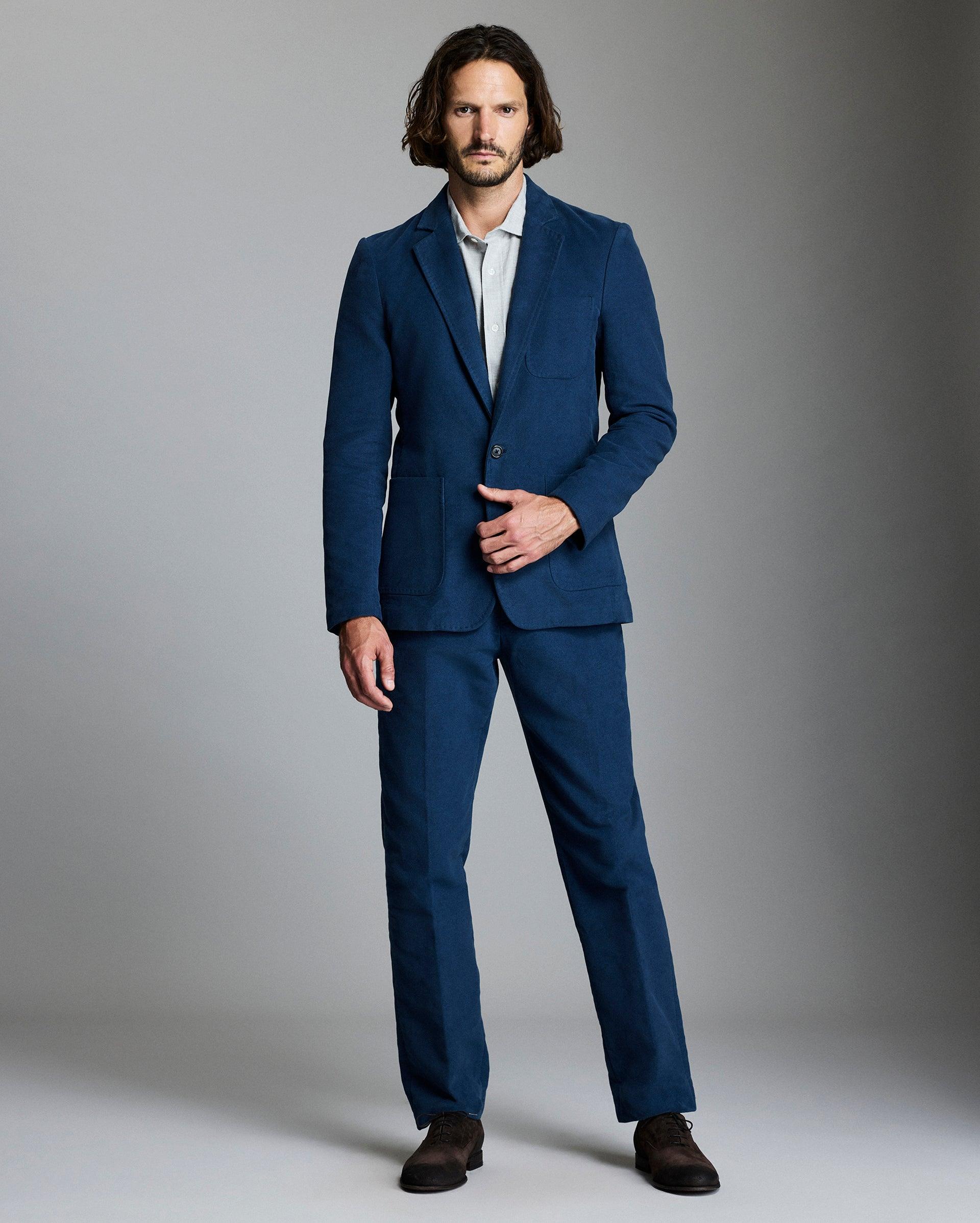 Our Flat Front Trouser is a slim-fit trouser woven from a soft, brushed moleskin in a rich denim blue. It features two front slash pockets, one waistband watch pocket with a button flap, two rear welt pockets with button tabs, belt loops on the waistband, and our heirloom ribbon stripe detailing on the interior waistba