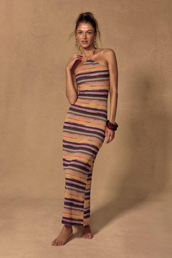 You'll be ready to go from catching waves to a beachside dinner in an instant with this crochet cover-up that is a getaway essential. A multicolored stripe-like design sweeps across the figure-flaunting silhouette, complete with a tying halter neckline and a chic maxi hem. A kick pleat at the back allows for an effortless strolling along the shore (before or after dinner).