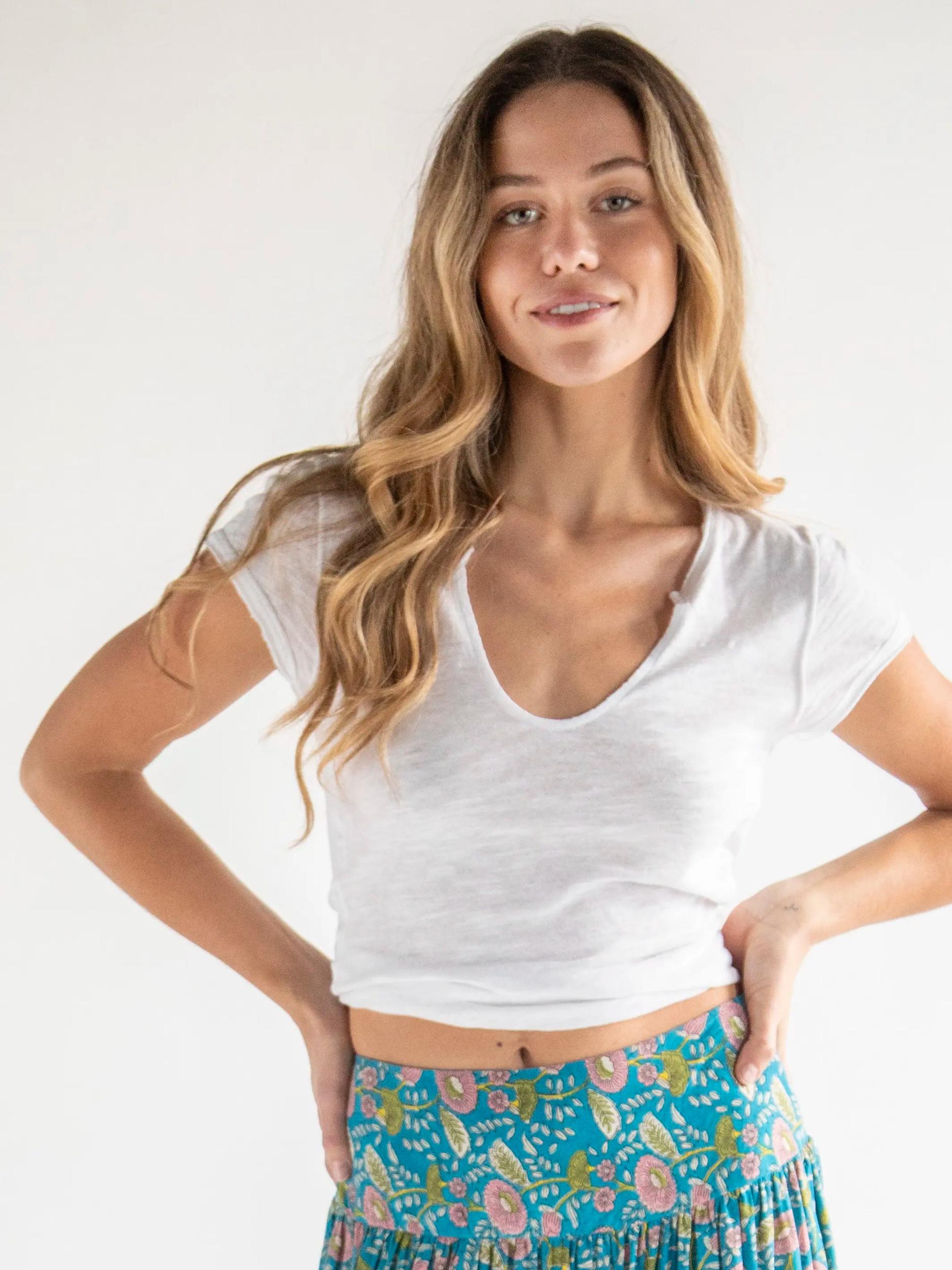 Our Molly Tee is your new go-to tee! Made from 100% cotton, this cap-sleeved tee is all things comfy and cool. It has raw edge details throughout and a flattering, split neckline. Wear this white t-shirt with our bottoms, from skirts to pants, or with your favorite jeans! It comes in other solid colors, so grab them all to have in your closet...trust us, you'll want to wear these tees on repeat!