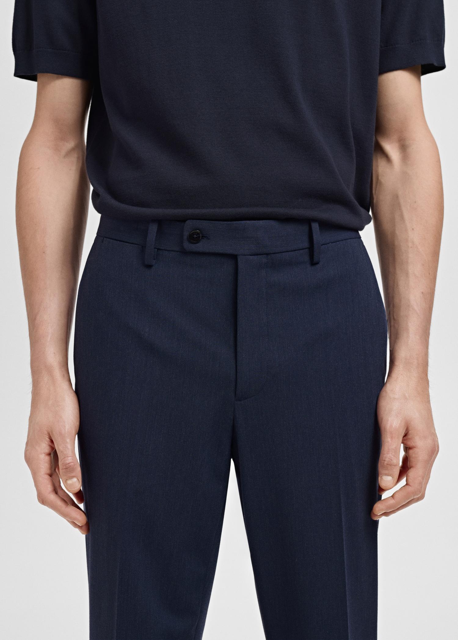 Slim fit. Tailoring collection. Belt loops. Front closure with double-breasted buttons and zipper. Two side pockets. Two welt pockets with button at the back. Ironed stripe detail at front and back. The model is 190 cm tall and wears a size 42. Inside leg measurement 33.43 in. Side length 44.49 in