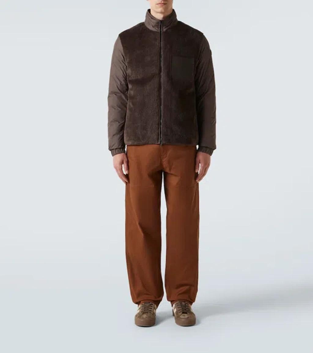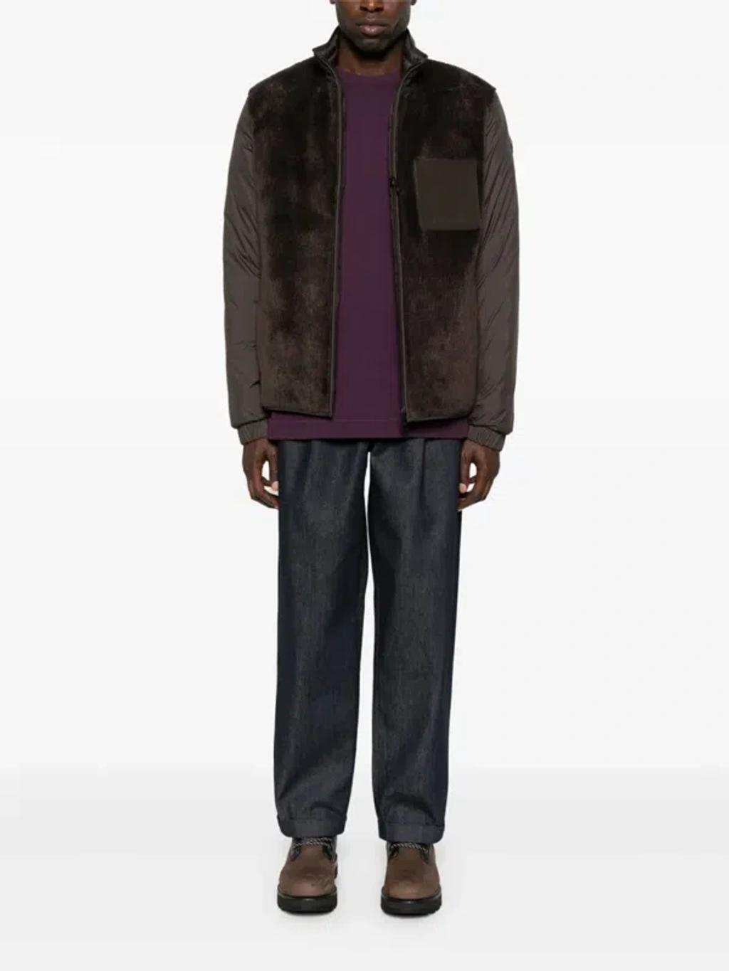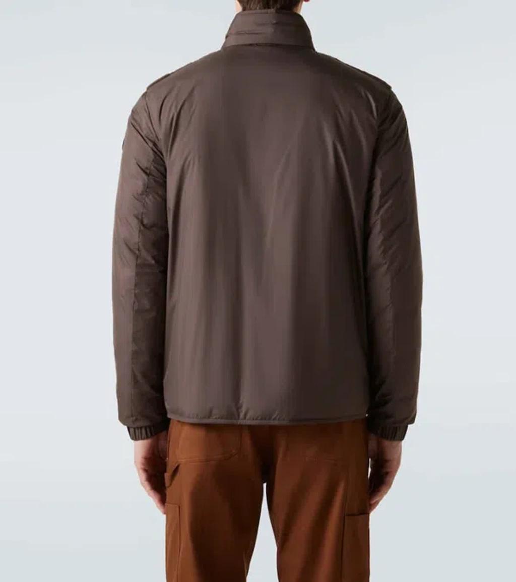 Shop Moncler Logo-patch Jacket In Brown from 800+ stores, starting at $2350. Material: 79% acrylic, 21% polyester. Care instructions: dry clean. Made in Romania. Designer color name: Dark Brown. Item color: brown. Details: 100% cow leather. Lining: 90% down, 10% feathers. Contains non-textile parts of animal origin. Pockets: internal pockets. Closure: two-way zipped front.