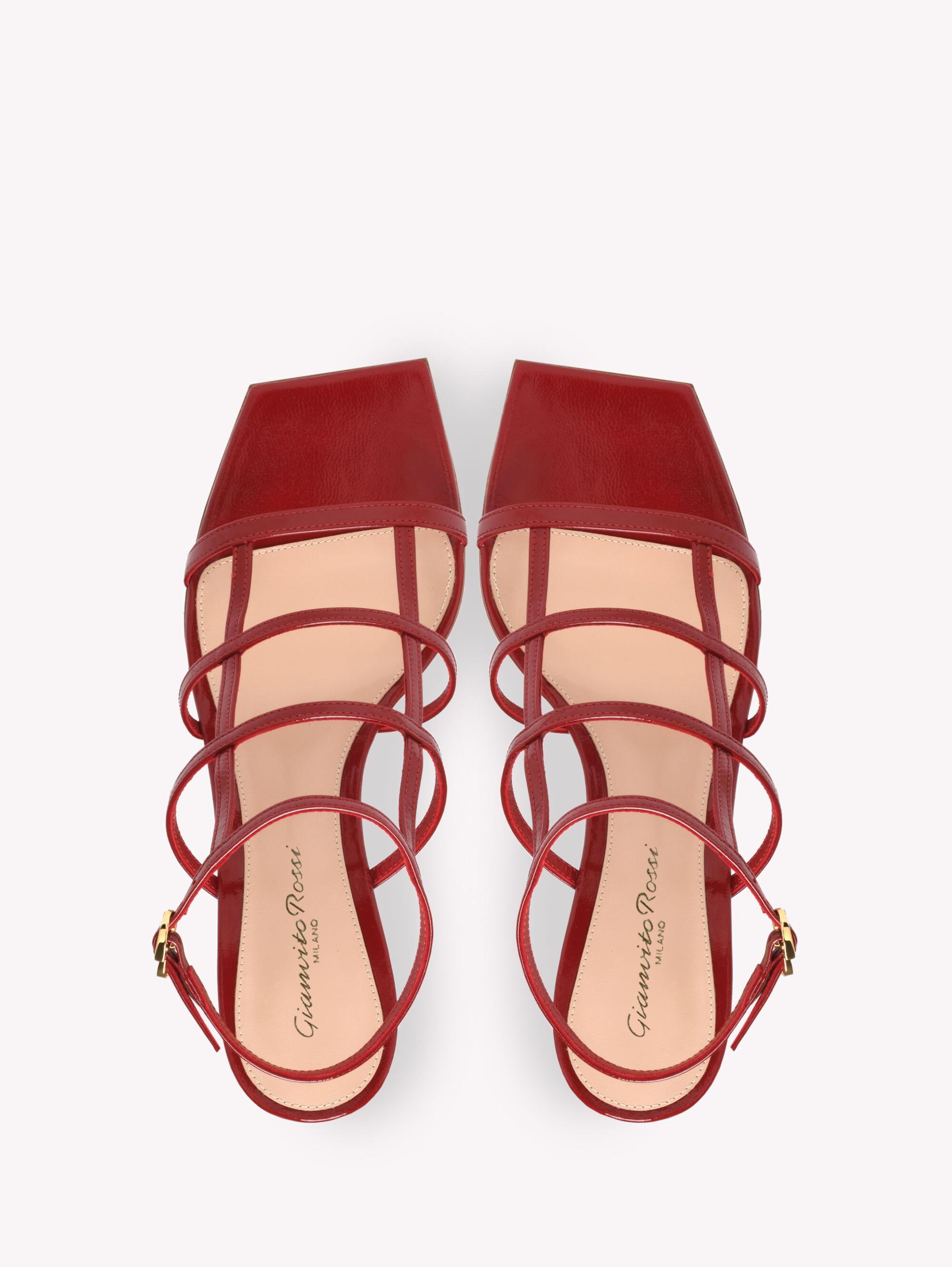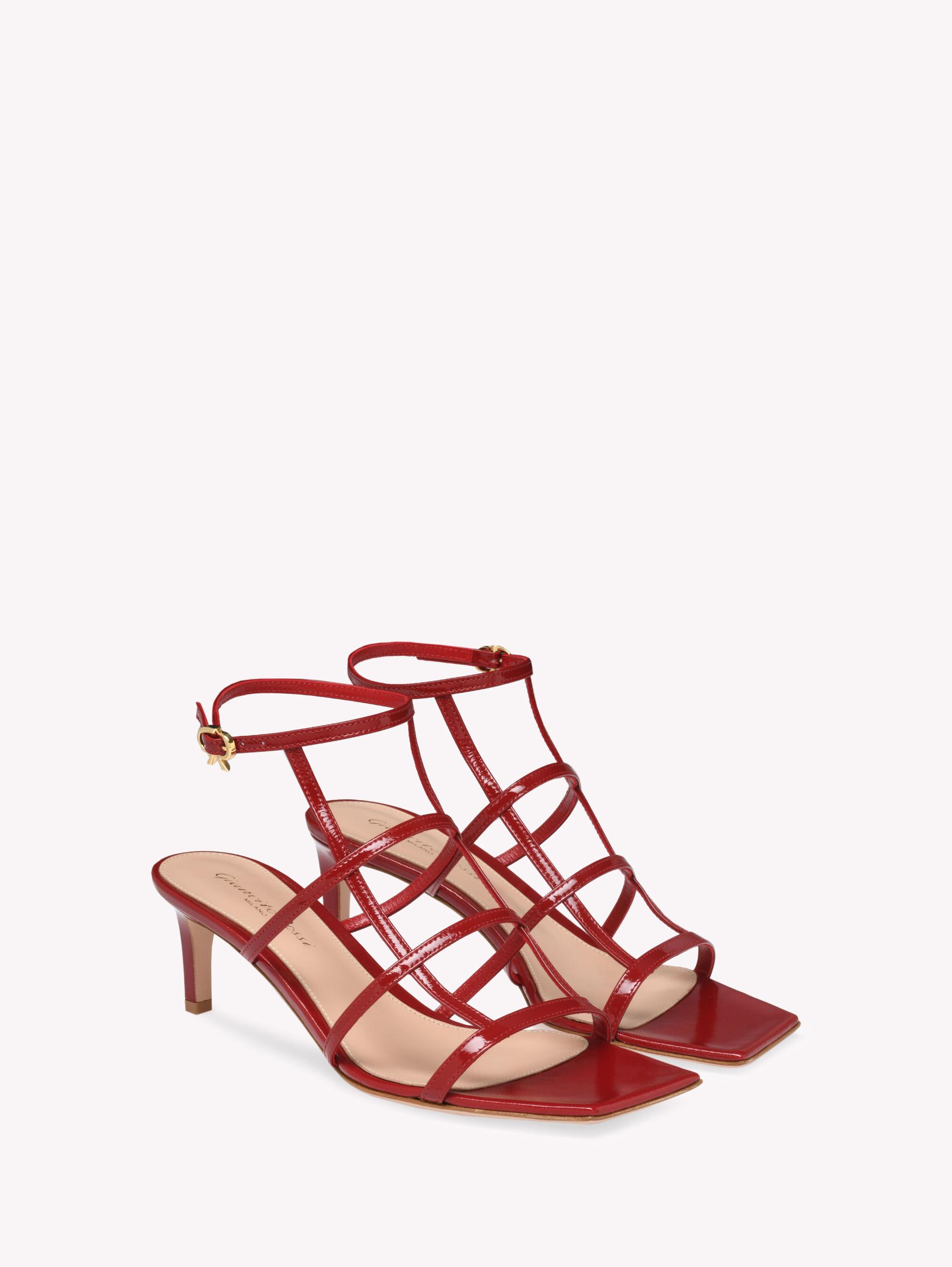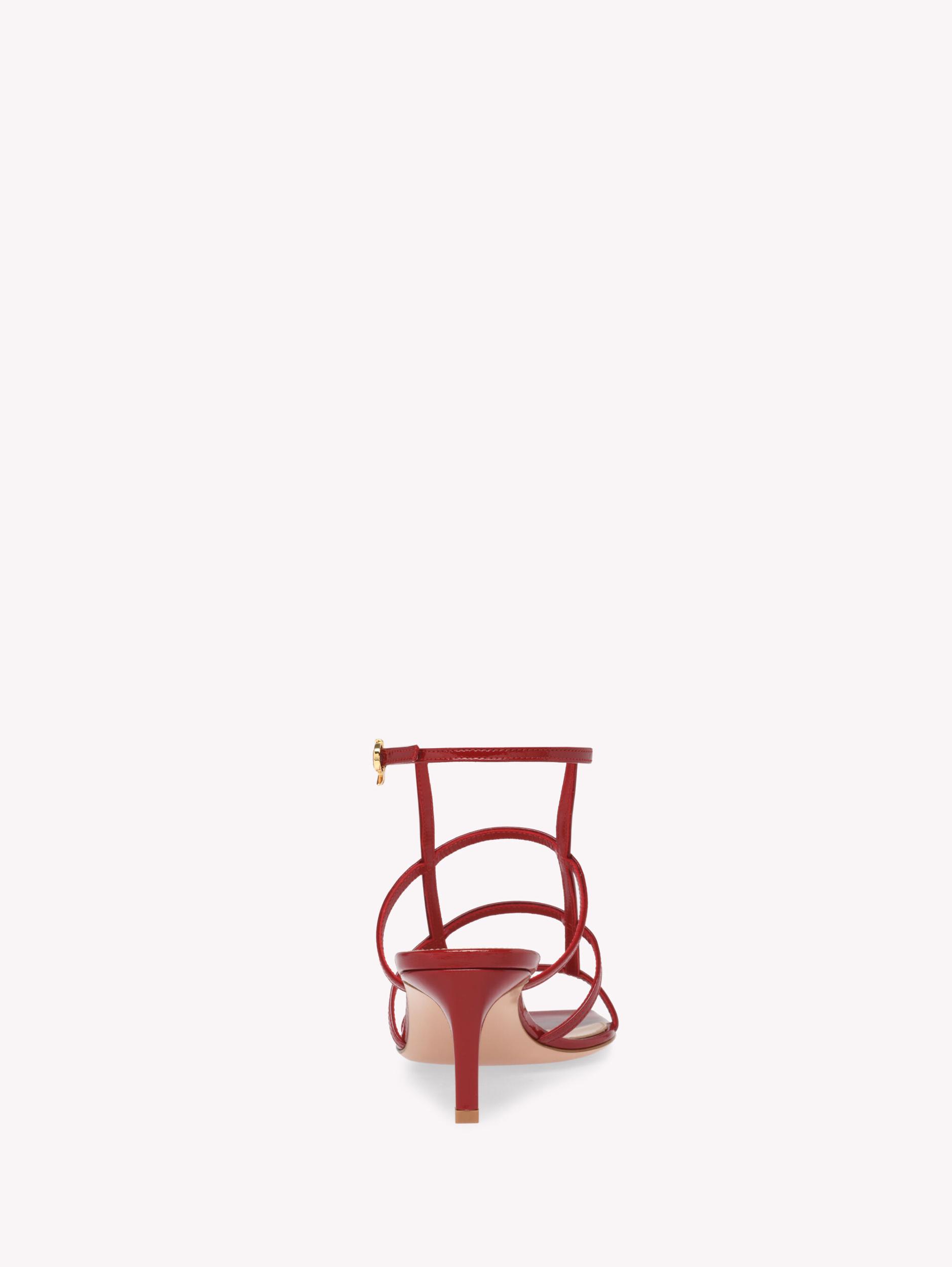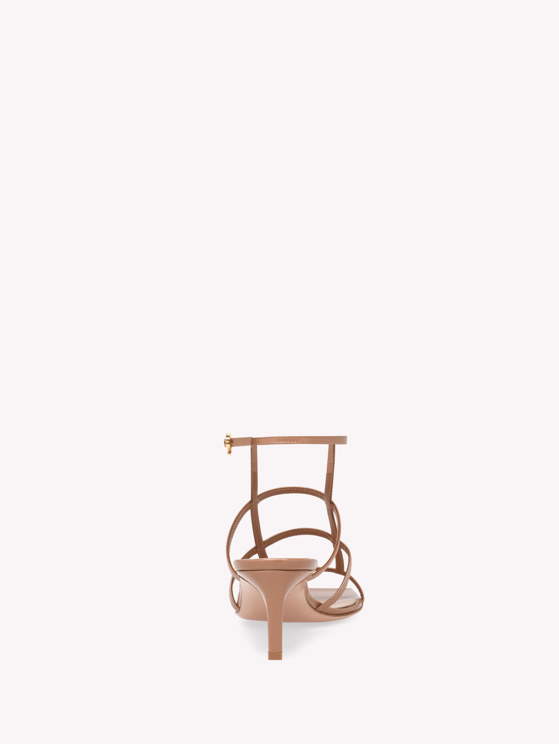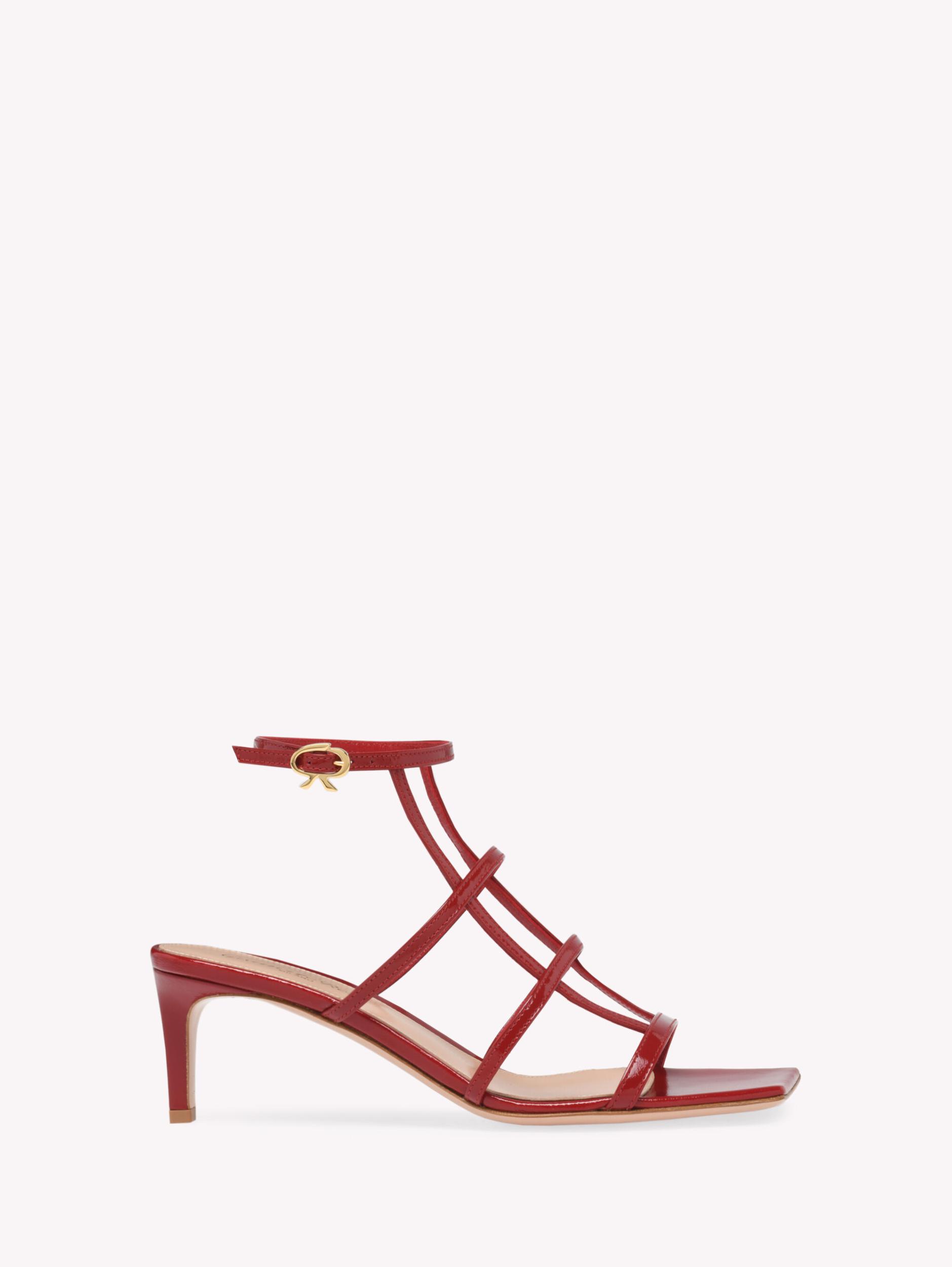 Crafted from precious leather, Mondry 55 is a square toe sandal with a 55mm square kitten heel. The design presents a geometric cage upper. The ankle strap is embellished with the iconic Ribbon buckle, signature of the Maison. Handmade in Italy.
