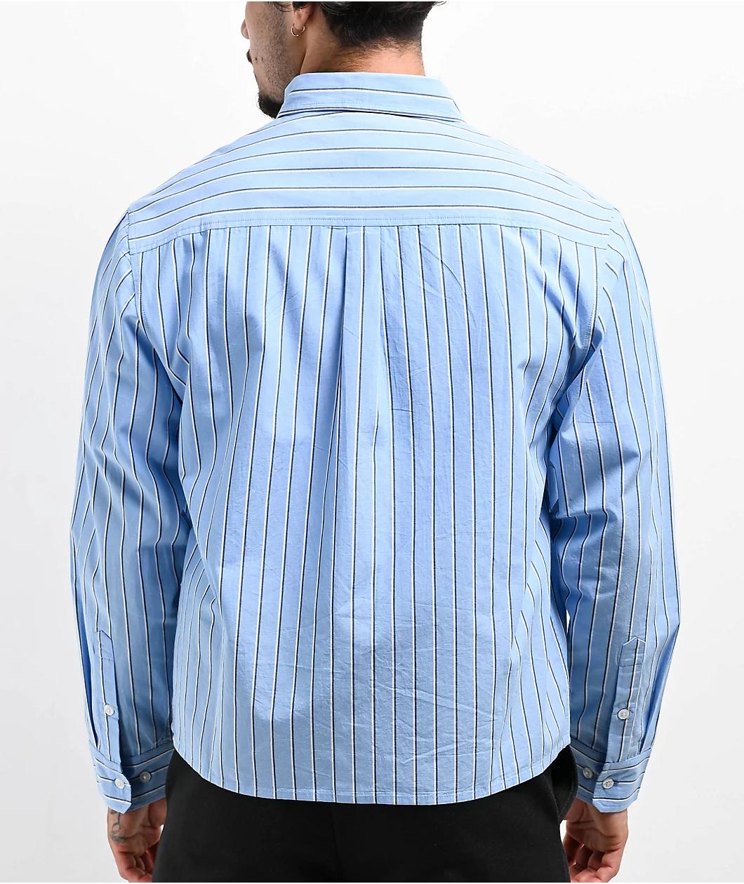 Monet Skateboards welcomes the Carousel striped long-sleeve button-up shirt with blue, white, and grey sublimated stripes. Offering a chest pocket on the left side with a black embroidered flower graphic for a clean look. This dress shirt has a full