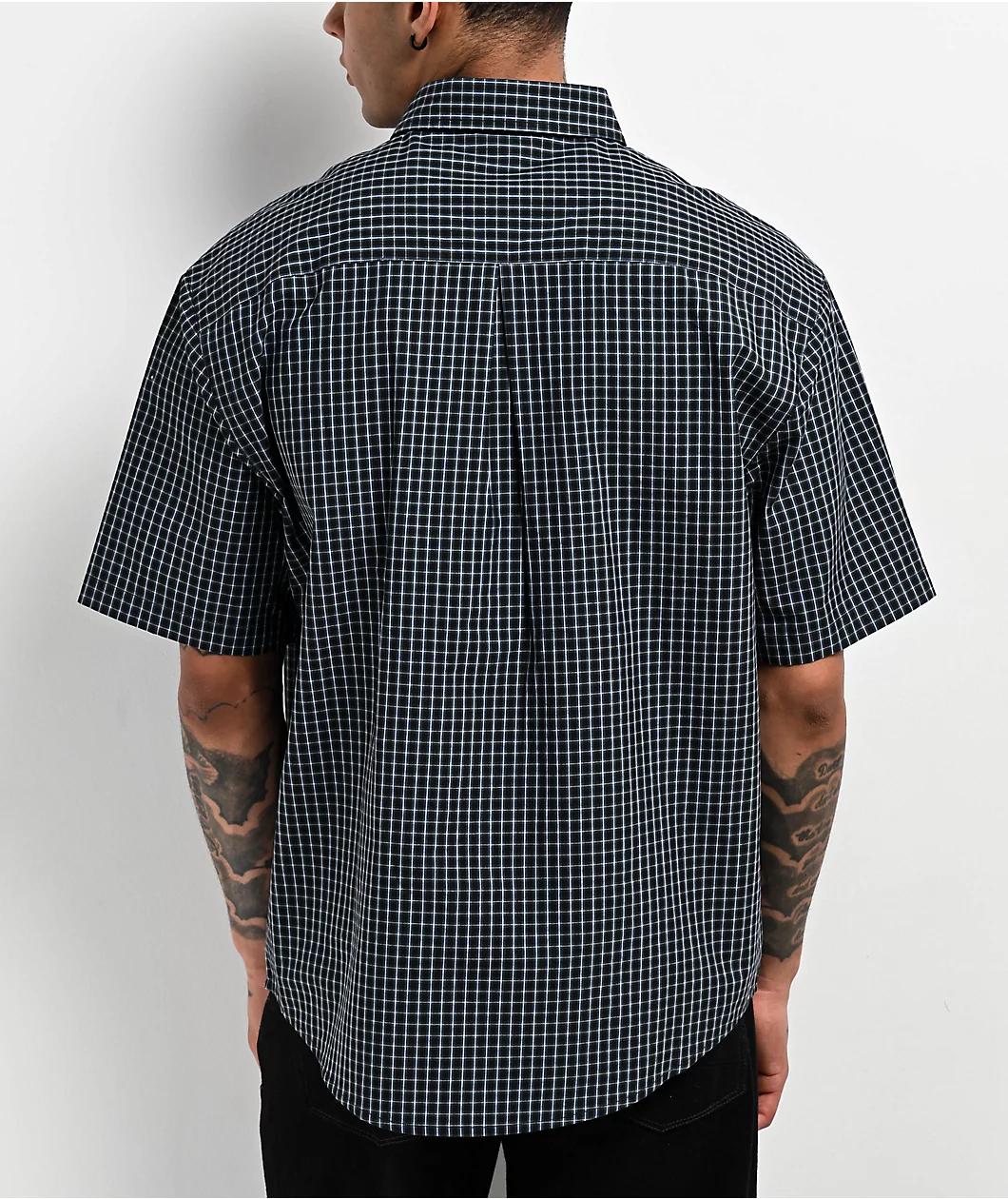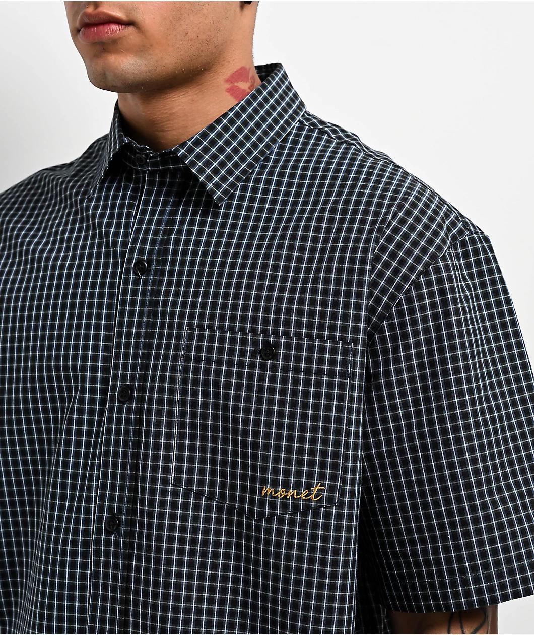Monet Skateboards showcases the Sweeper short sleeve shirt in a blue plaid design. This button-up shirt has a pocket on the left side with gold embroidered branding. Utilizing 100% cotton, this Monet Skateboards shirt has a turn-down collar, a full b