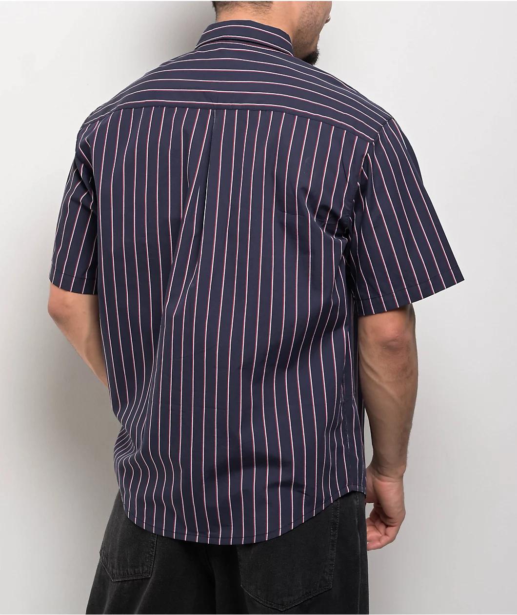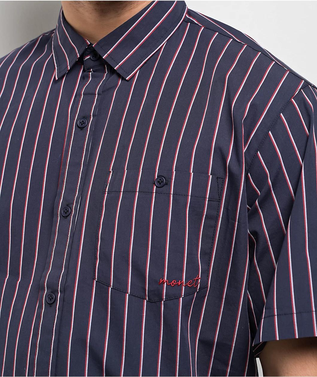 The folks at Monet Skateboards welcome the Sweeper button up shirt in a red, white, and blue stripe color scheme. Inspired by classic silhouettes, this shirt has red embroidered branding on the left chest pocket. Made from durable cotton, this shirt