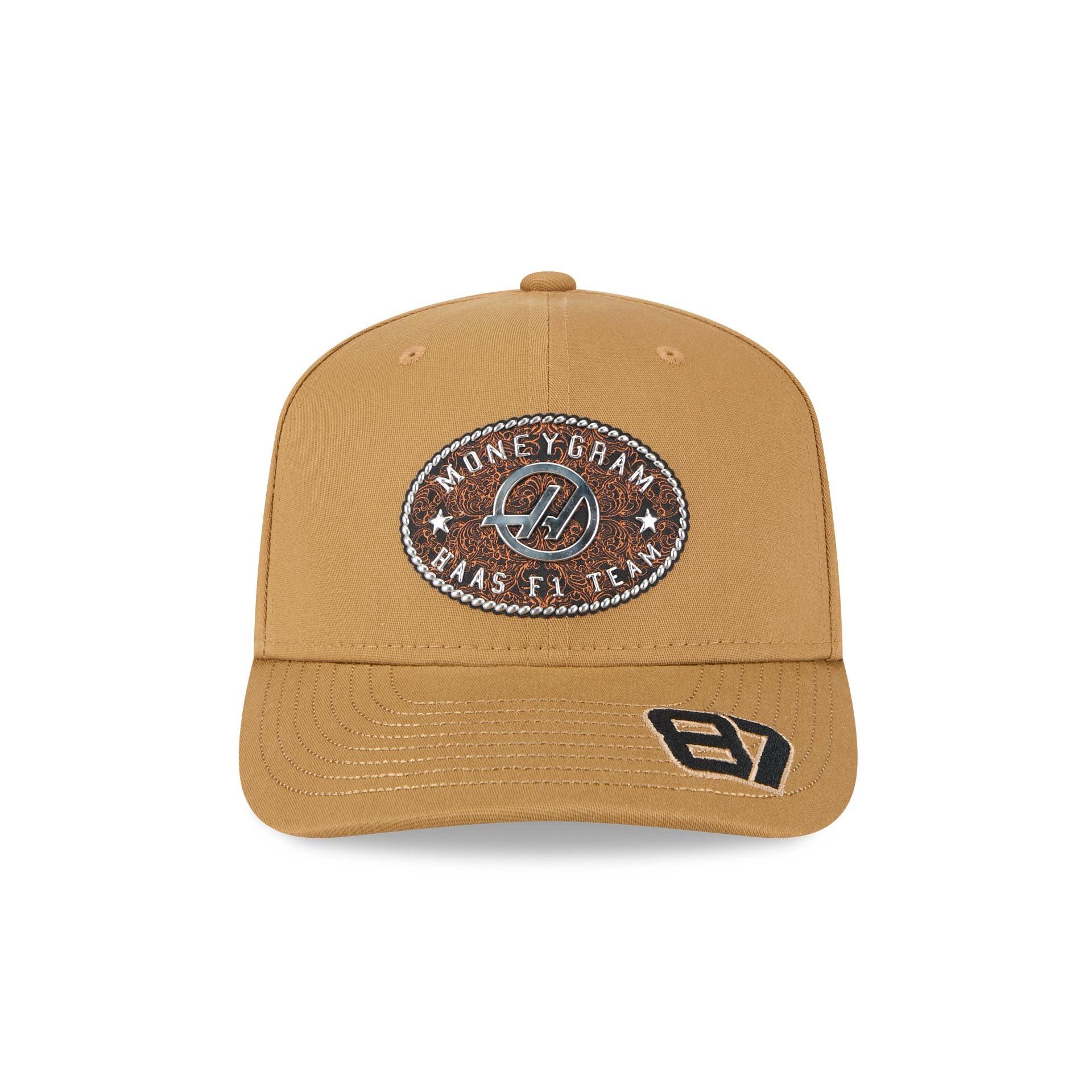The MoneyGram Haas F1 Team 2025 Austin Race Special Oliver Bearman 9SEVENTY Stretch-Snap features a raised rubber Haas F1 Team patch at the front panels with an HD screen-printed MoneyGram logo at the right-wear side and the driver's number at the visor. Additional details include an adjustable stretch-snap closure at the rear and a black undervisor.