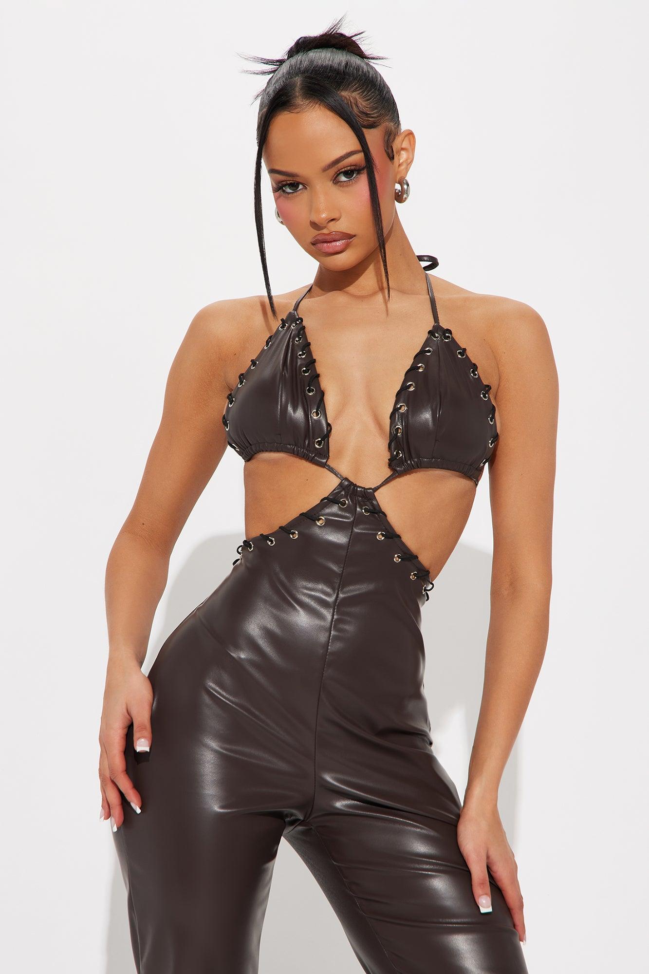Available In Chocolate. Jumpsuit Grommet Detail Invisible Back Zip Closure Flare Leg Slight Stretch Inseam = 34" Self: 55% Polyurethane 45% Polyester Lining: 100% Polyester Imported California Proposition 65 WARNING: Cancer and Reproductive Harm - www.P65Warnings.ca.gov.