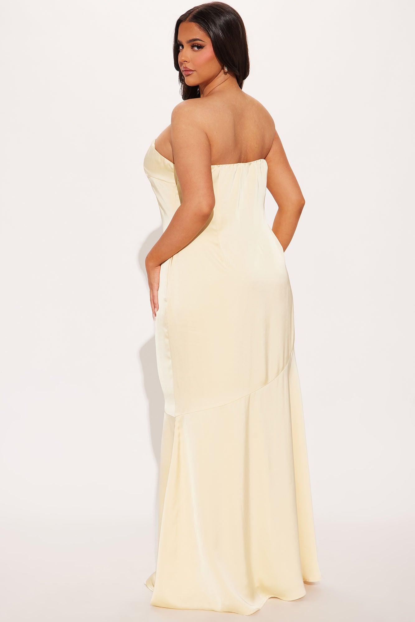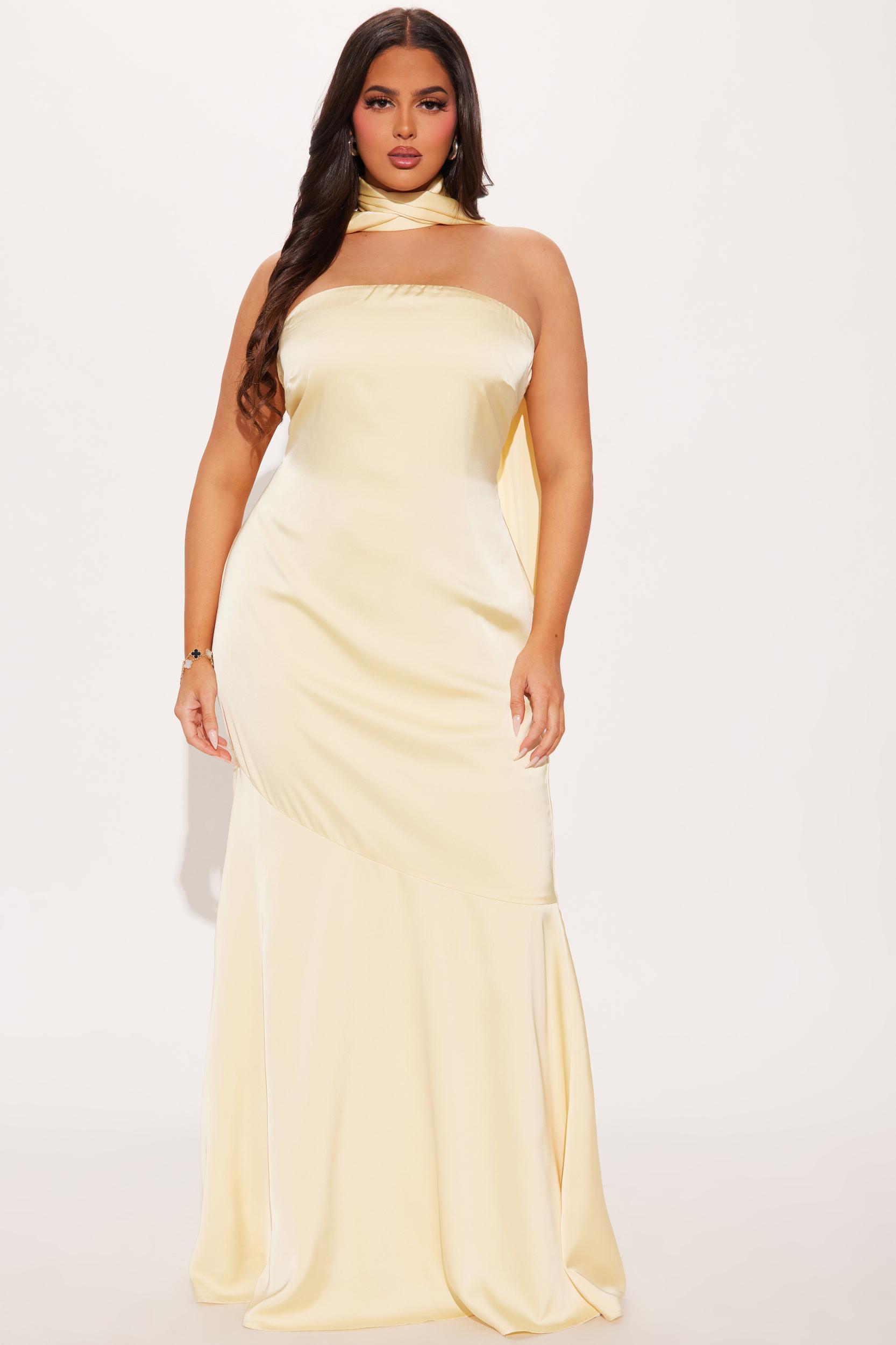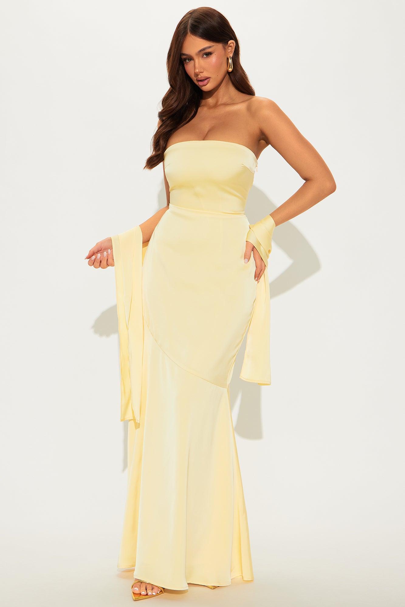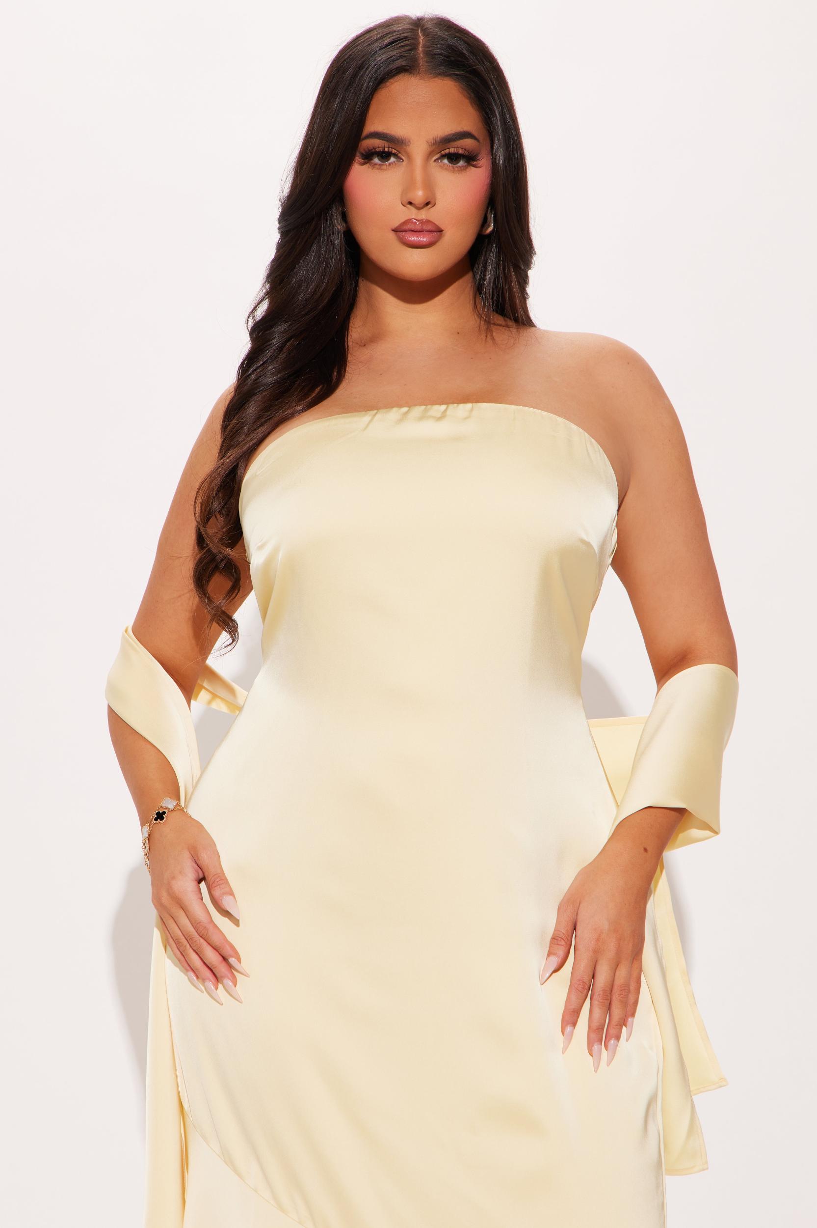 Available In Butter Yellow And Wine. Satin Gown Detached Scarf/ Shawl Strapless Hidden Side Zipper Lined Stretch Self : 100% Polyester Lining : 95% Polyester , 5% Spandex Imported