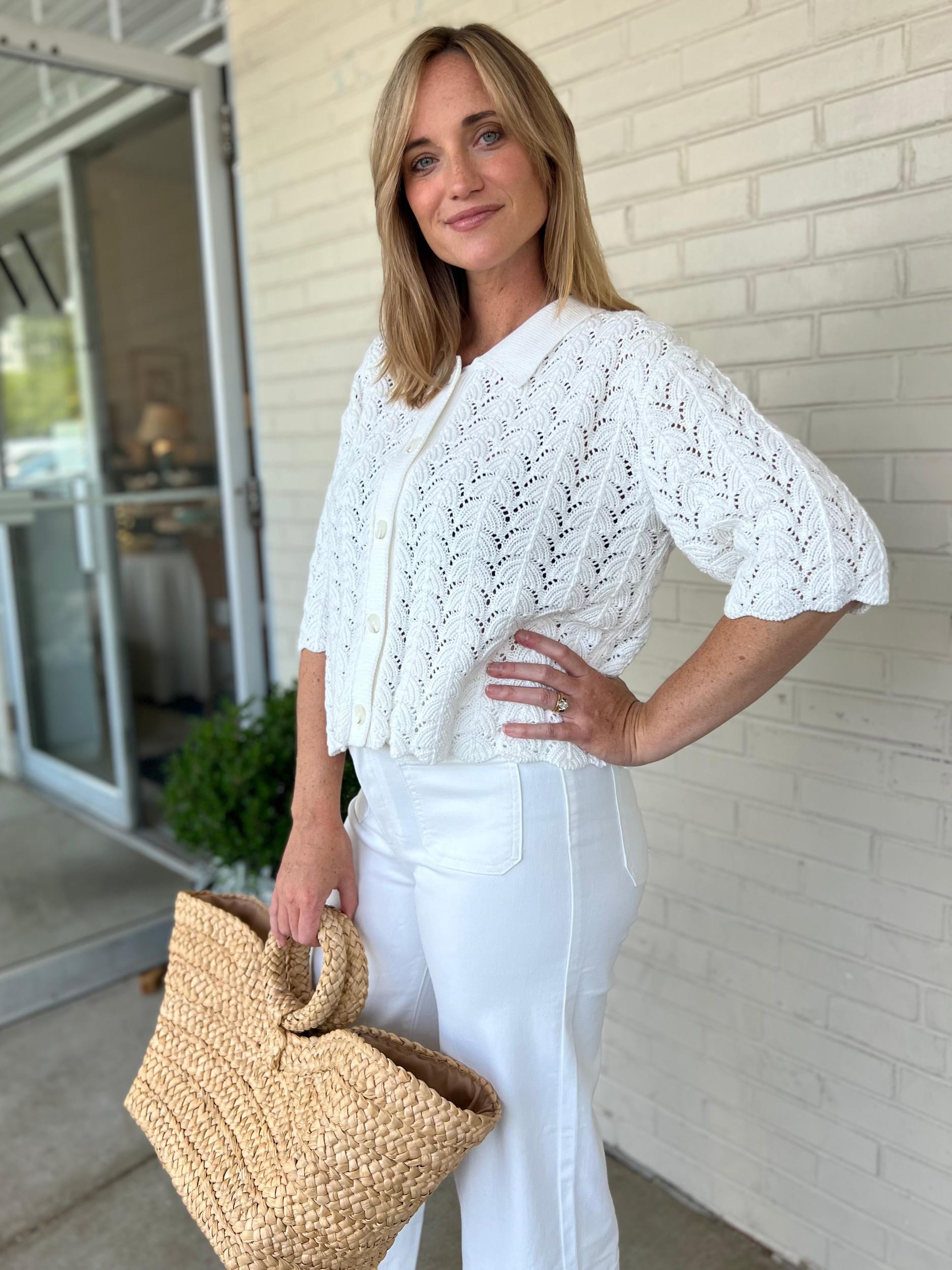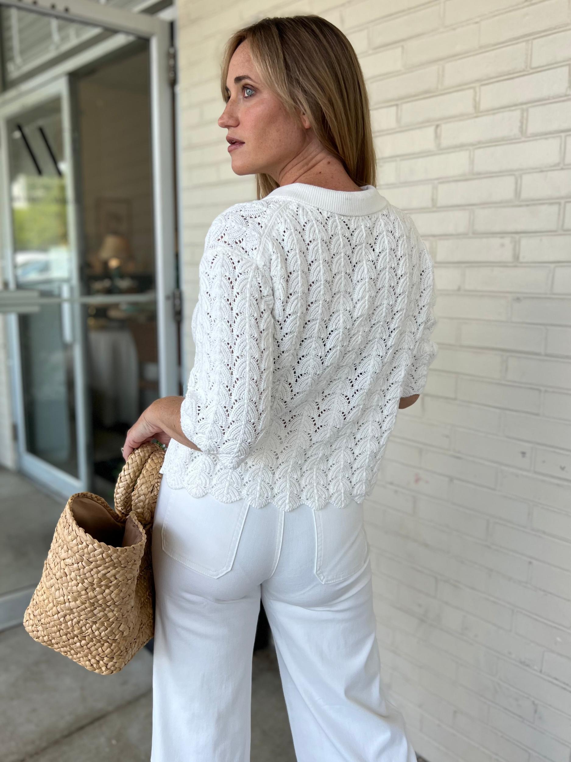 The Monica Cardigan brings whimsical charm to your wardrobe with its delightful scallop knit detailing! This ivory short-sleeve button-front sweater features an adorable collar that adds just the right touch of vintage-inspired fun. Perfect for tossing over summer dresses or pairing with your favorite jeans for a carefree, put-together look that's ready for ice cream dates or weekend adventures!