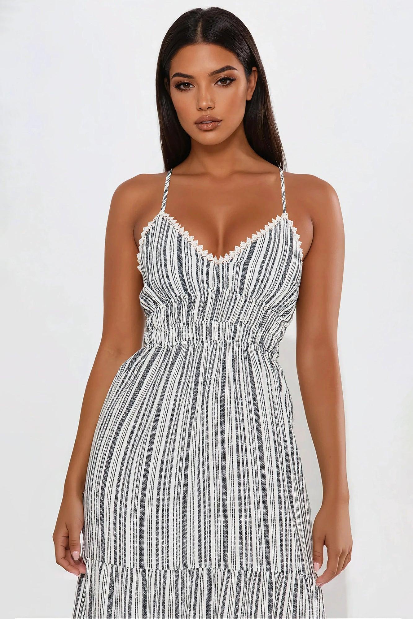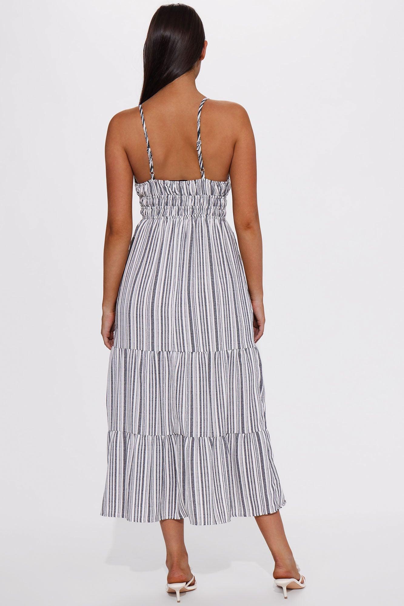 Available In Ivory/combo. Striped Midi Dress V-neck Tie shoulder spaghetti straps Smocked Tiered Stretch Length = 41" Disclaimer: Pattern Placement May Vary. 100% Polyester Imported