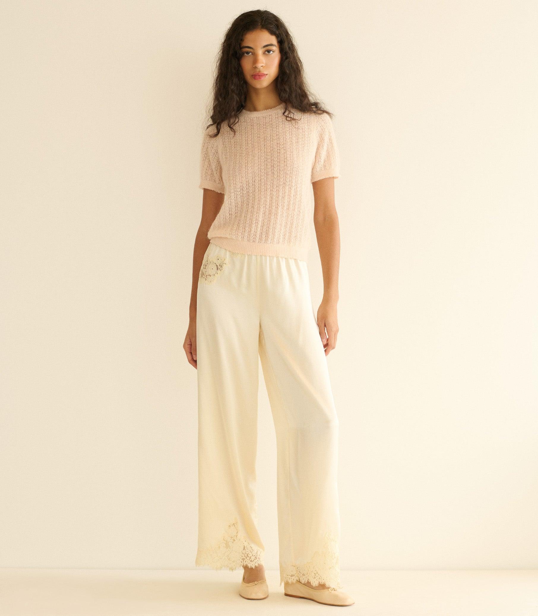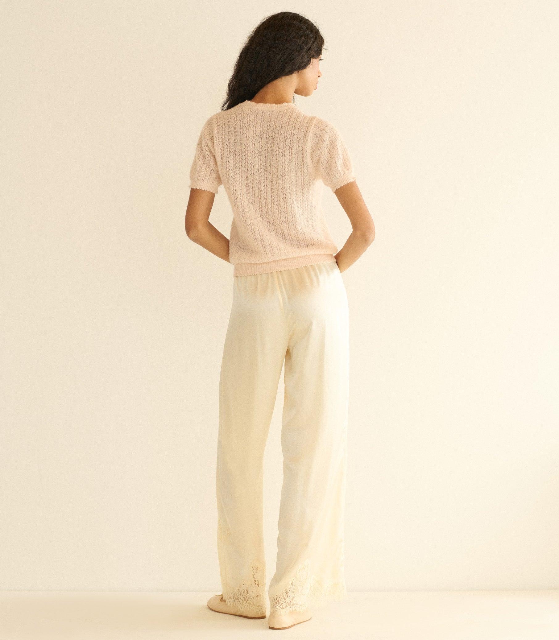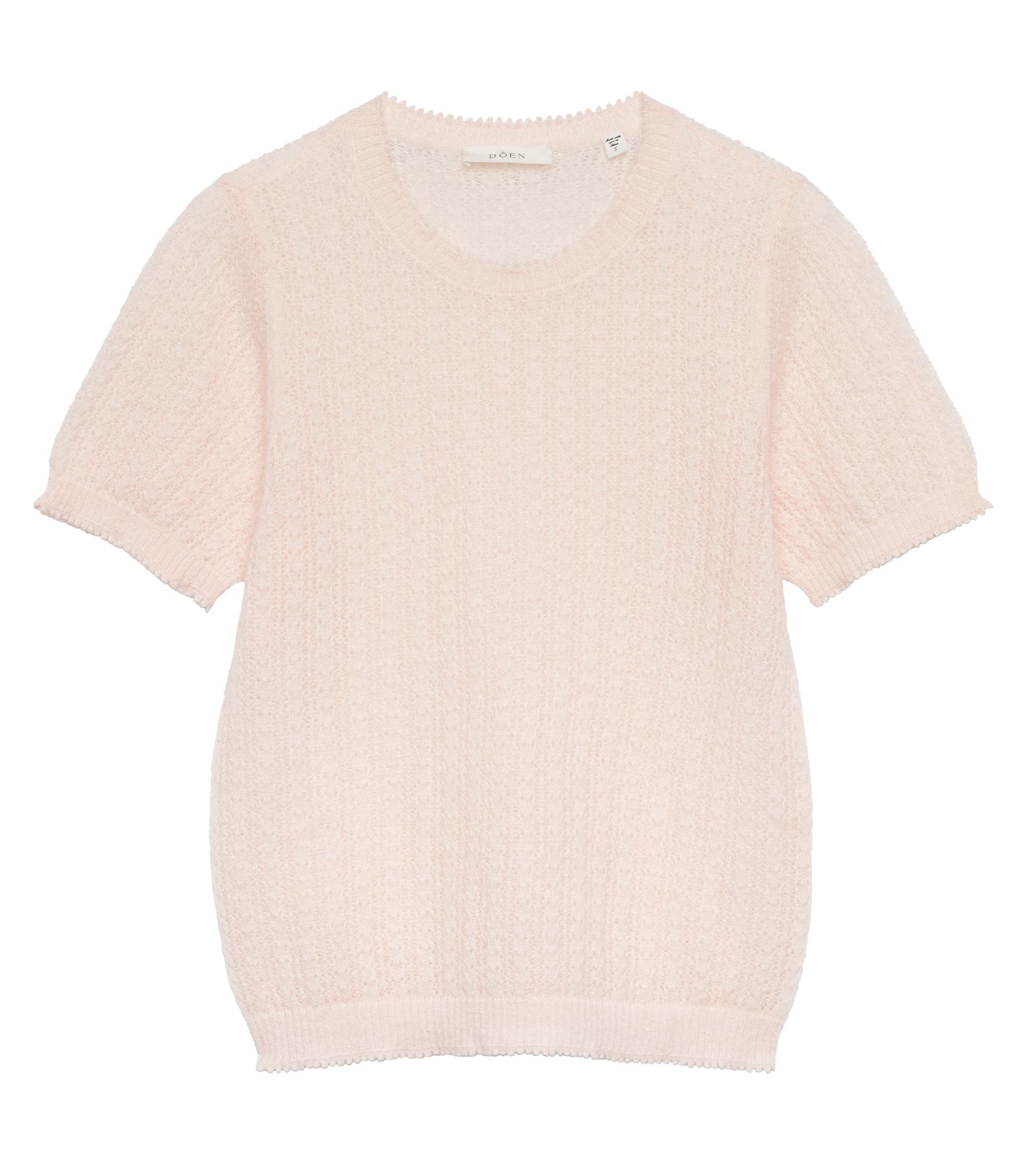 In a soft, slightly sheer blend of superfine alpaca and merino wool, the ‘60s-inspired Monica Sweater features a delicate allover pointelle design, short sleeves, and ribbed detailing at the cuffs, neckline, and hem. Hitting slightly below the true waist, it can be layered or worn on its own.