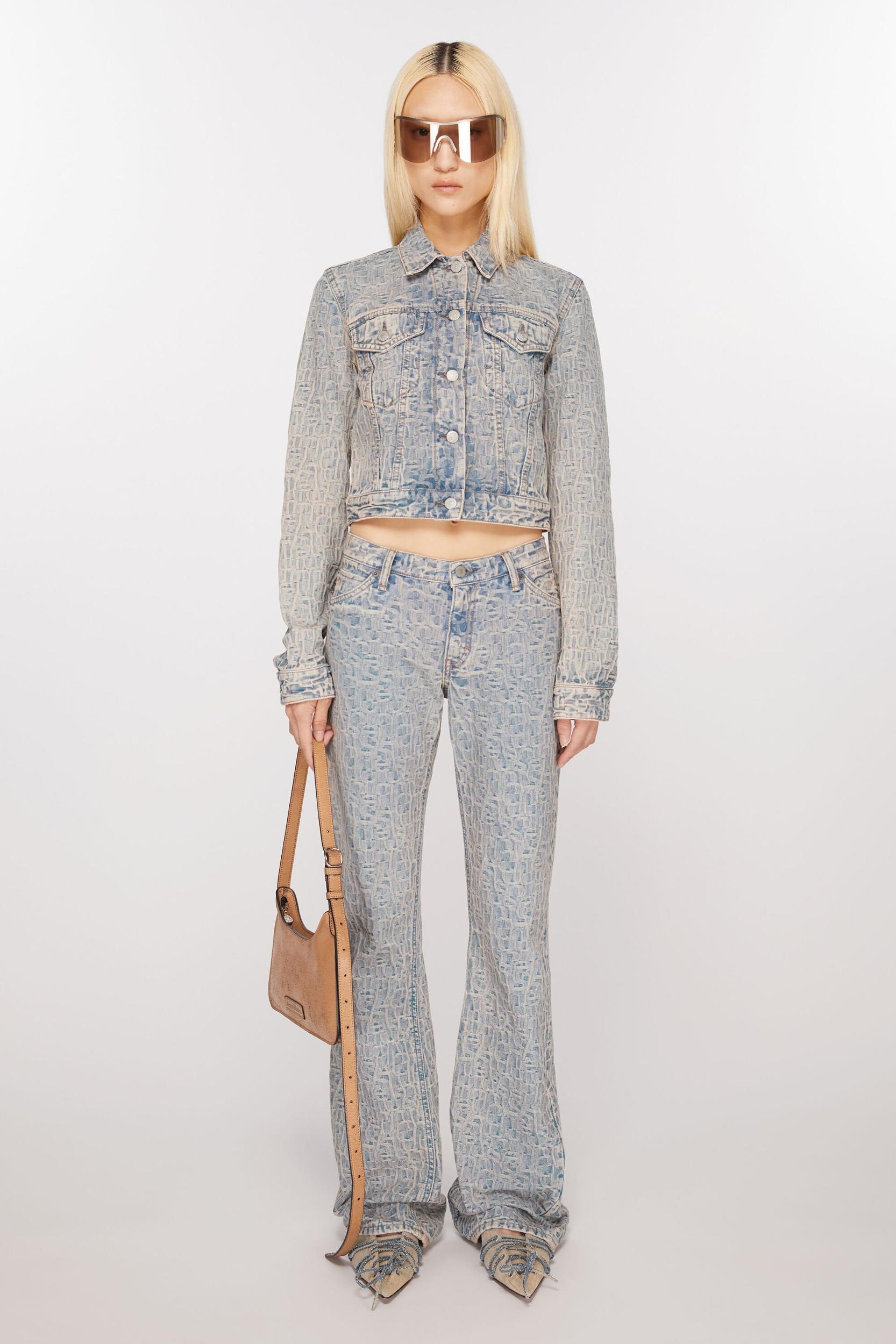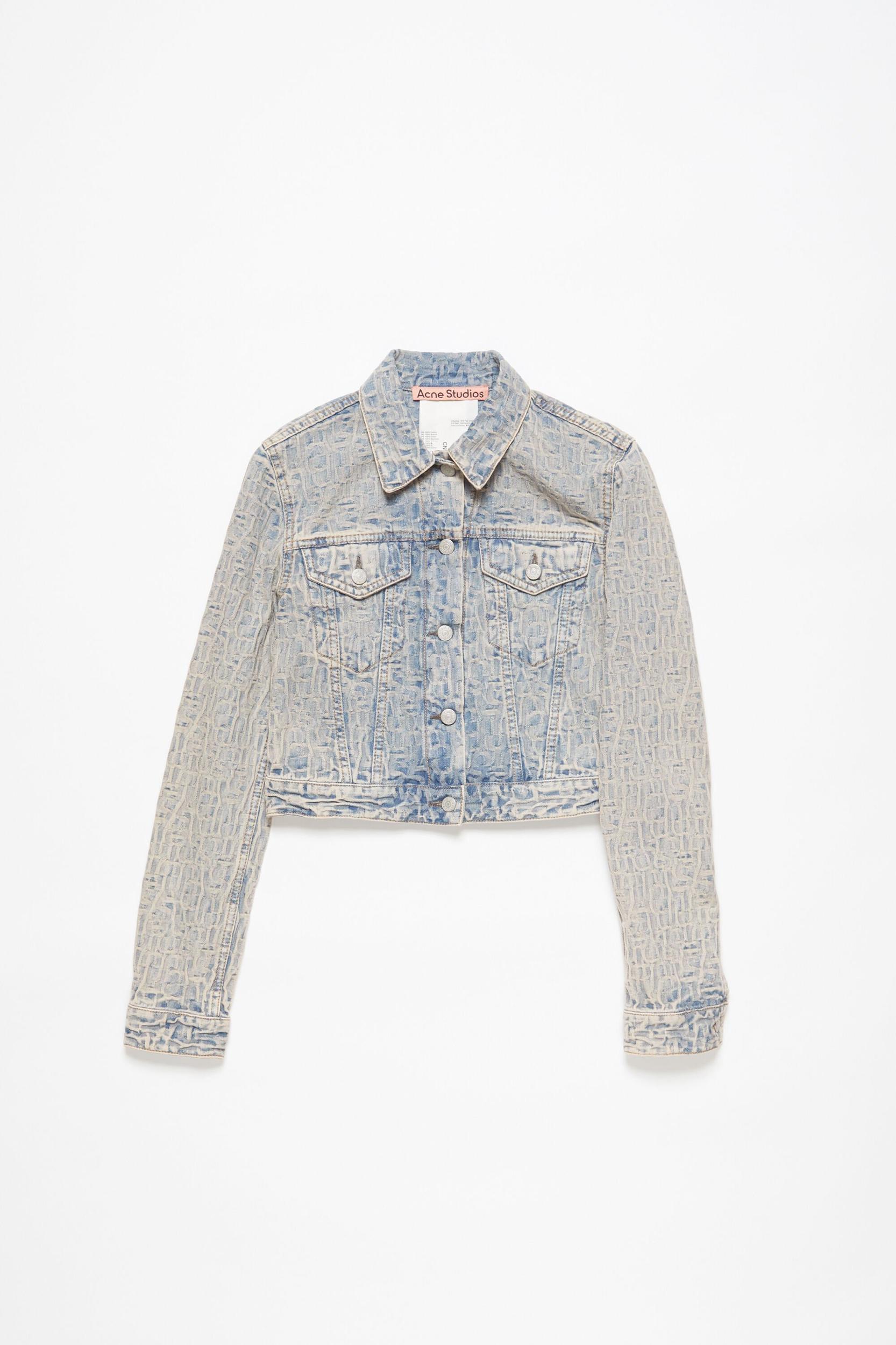 Denim jacket is cut to a fitted fit with narrow shoulders and a cropped length. Adorned with a monogram jacquard made of non-stretch cotton in a blue/beige wash. FN-WN-OUTW000882