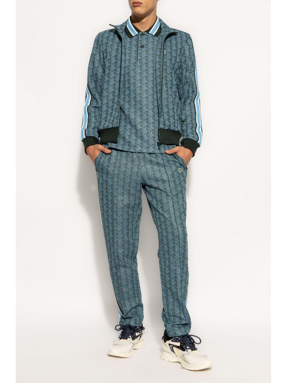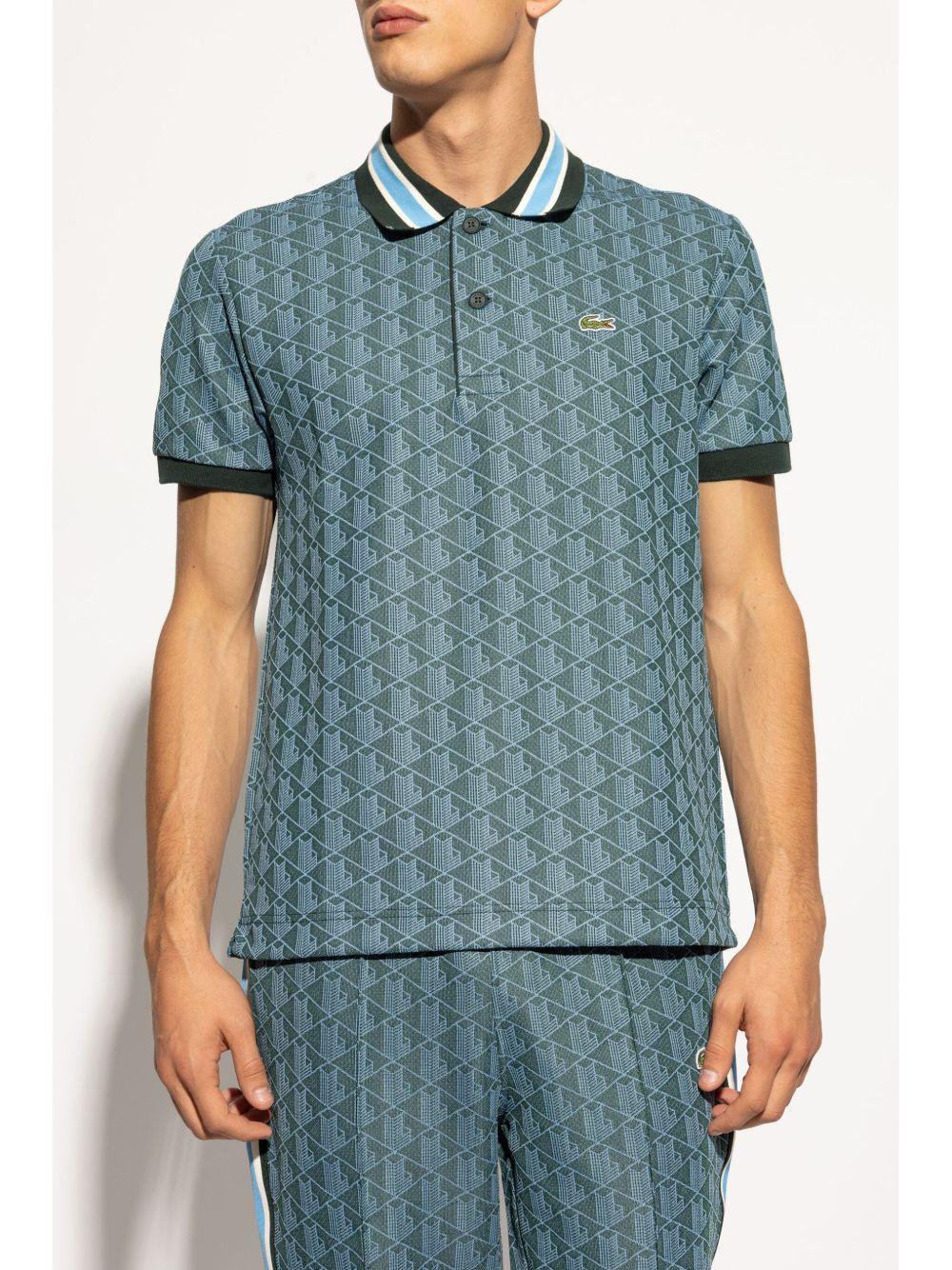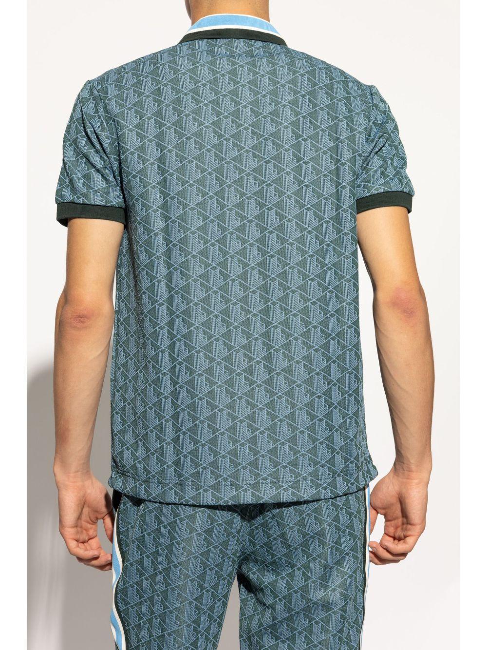 Lacoste monogram pattern polo shirt | Green | green | monogram pattern | short front button fastening | stripe detailing | polo collar | embroidered logo at the chest | short sleeves | ribbed cuffs | straight hem | Polyester/Cotton/Polyamide | Polo Shirts | Clothing | Men