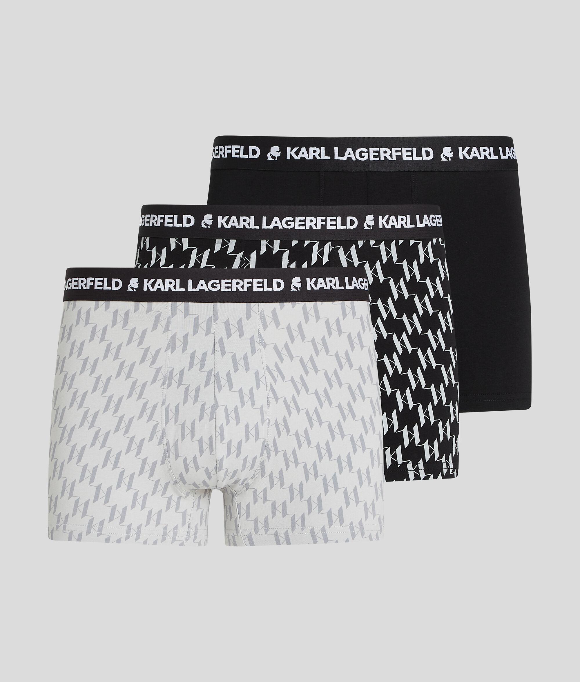 Discover a trio of essentials designed for comfort and style. This set features three trunks, each adorned with the iconic KARL LAGERFELD logo at the waist and an all-over monogram design.