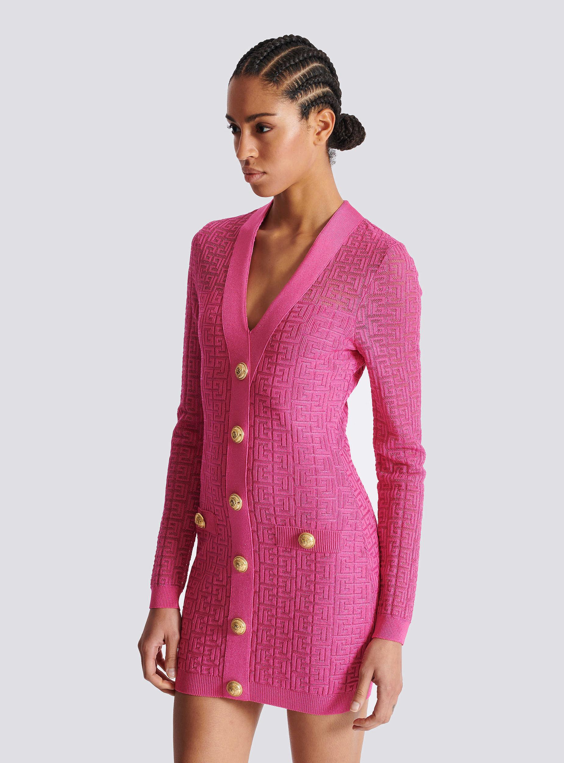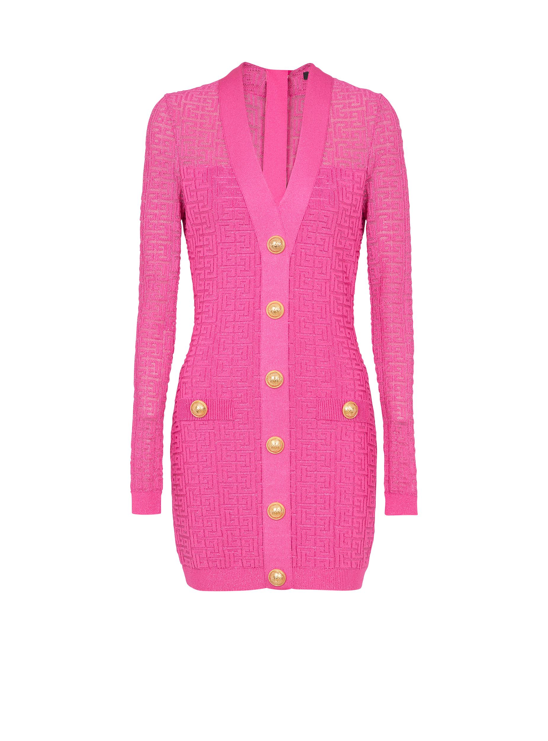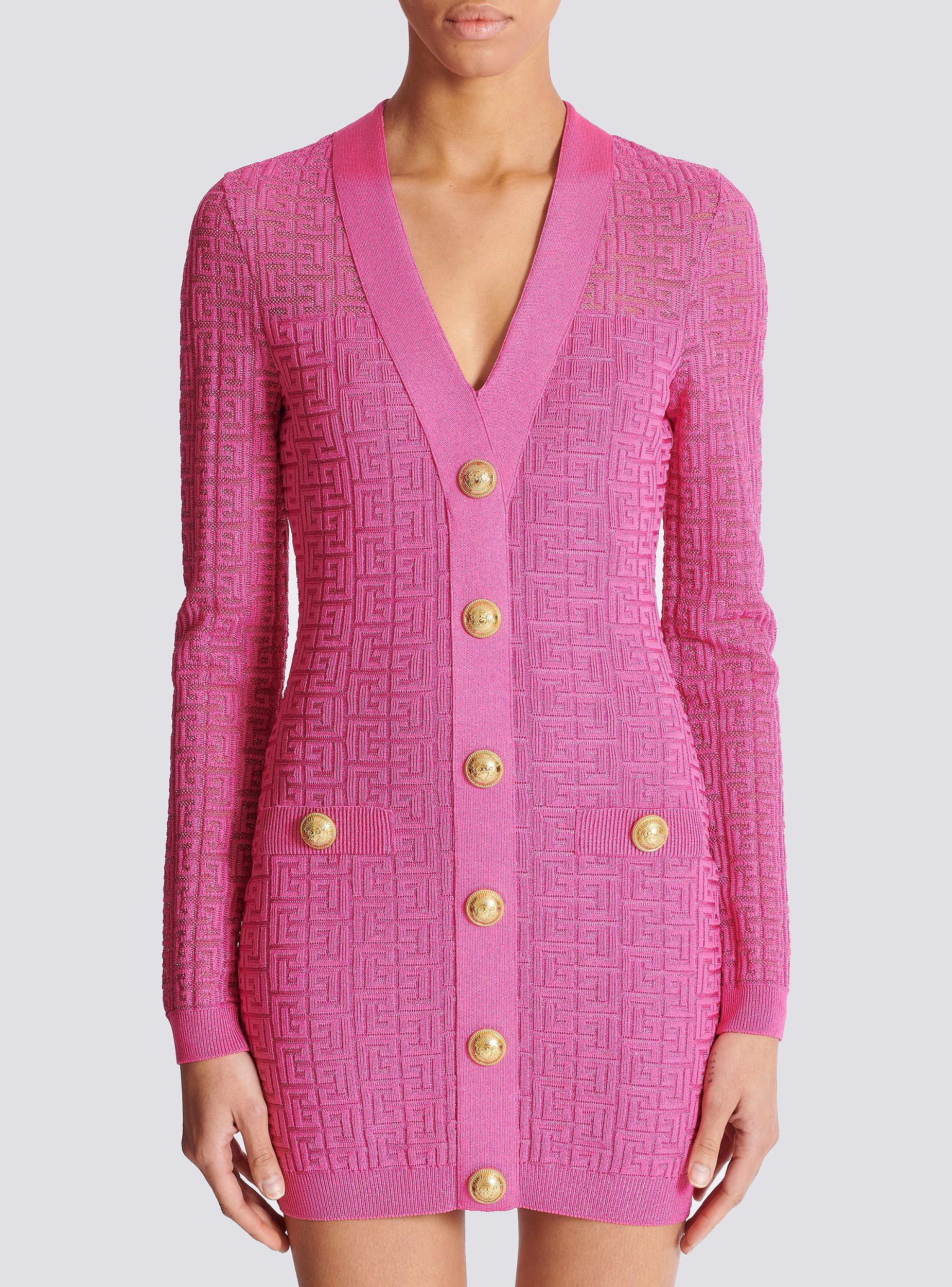 Knit dress with PB Labyrinthe monogramPlunging V-neckLong sleevesSheer layers at the shoulders and sleeves6 decorative buttons on the front2 trompe-l'œil pockets with 2 decorative buttons2 trompe-l'œil front pockets with buttons“Coin” golden metal buttonVisible gold metal zip fastening on the back with Balmain Paris-engraved sliderKnit with shiny threadsRibbed trimCropped slim fitModel measures 179cm and wears a size 36Main material: 66% viscose 17% cupro 9% polyester 4% polyamide 3% metallic polyester 1% elastaneMade in FranceItem: EF2R8870KG96100% of the viscose fibres used to make this garment are recycled and certified