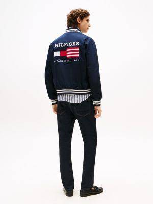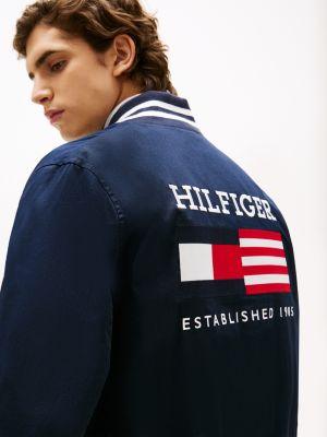 Tommy Hilfiger men's jacket. Inspired by the collegiate classic, we give you our latest iteration of the varsity jacket made from organic cotton with striped trim. This lightweight outer layer is finished with our monotype flag box logo at the back for an Americana-inspired feel.