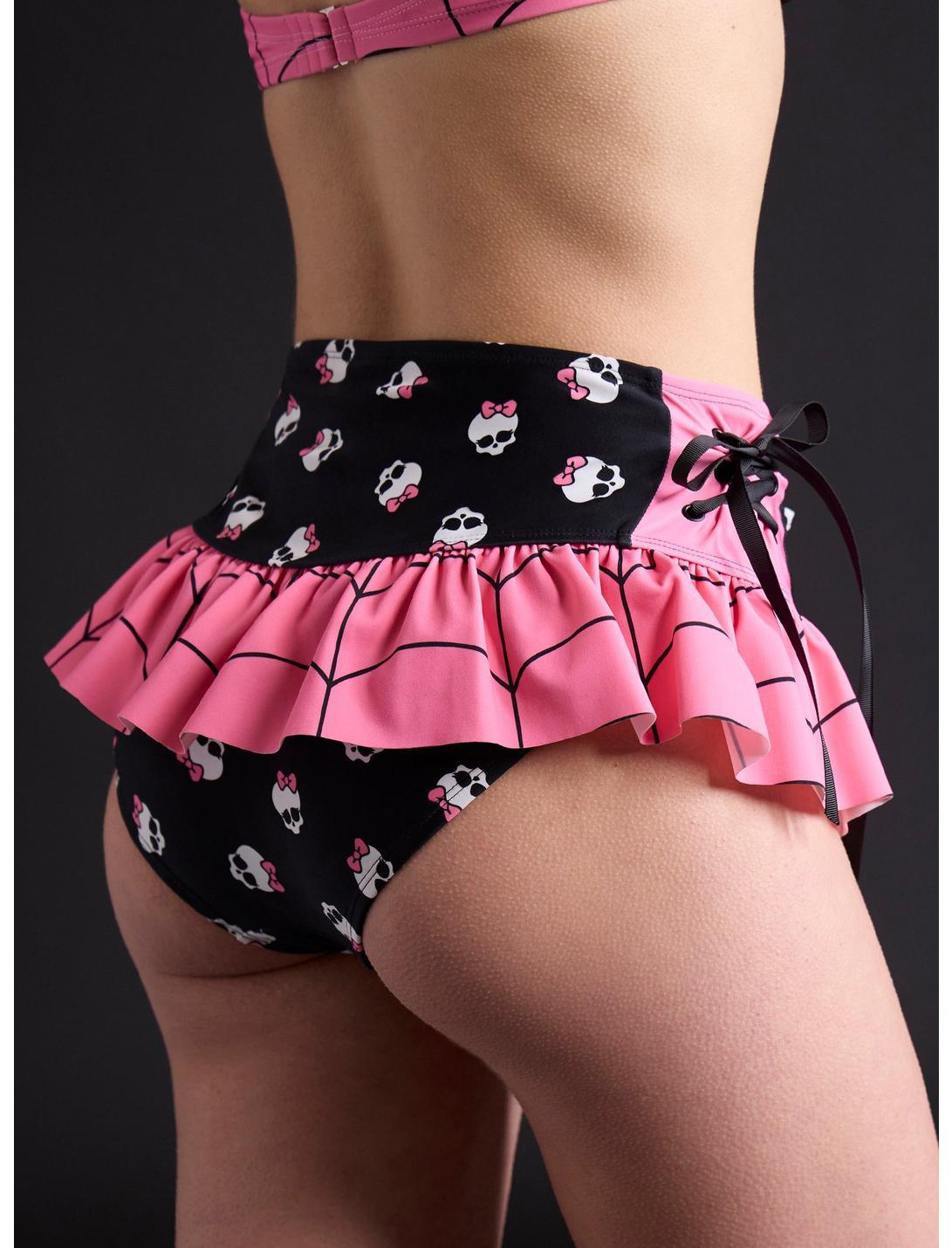 Look scary cute for your day at Gloom Beach in these Monster High skirted swim bottoms! Featuring an allover print of her skullette and a ruffle skirt with spiderweb designs. Comes with lace-up detailing on the sides. Pair them with the matching top for the ultimate hot ghoul summer look!Top not included.Swimwear can only be returned unworn with original tags intact and sanitary panel in place.82% nylon; 18% spandexHand wash cold; dry flatImportedListed in junior sizesModel wears size Small