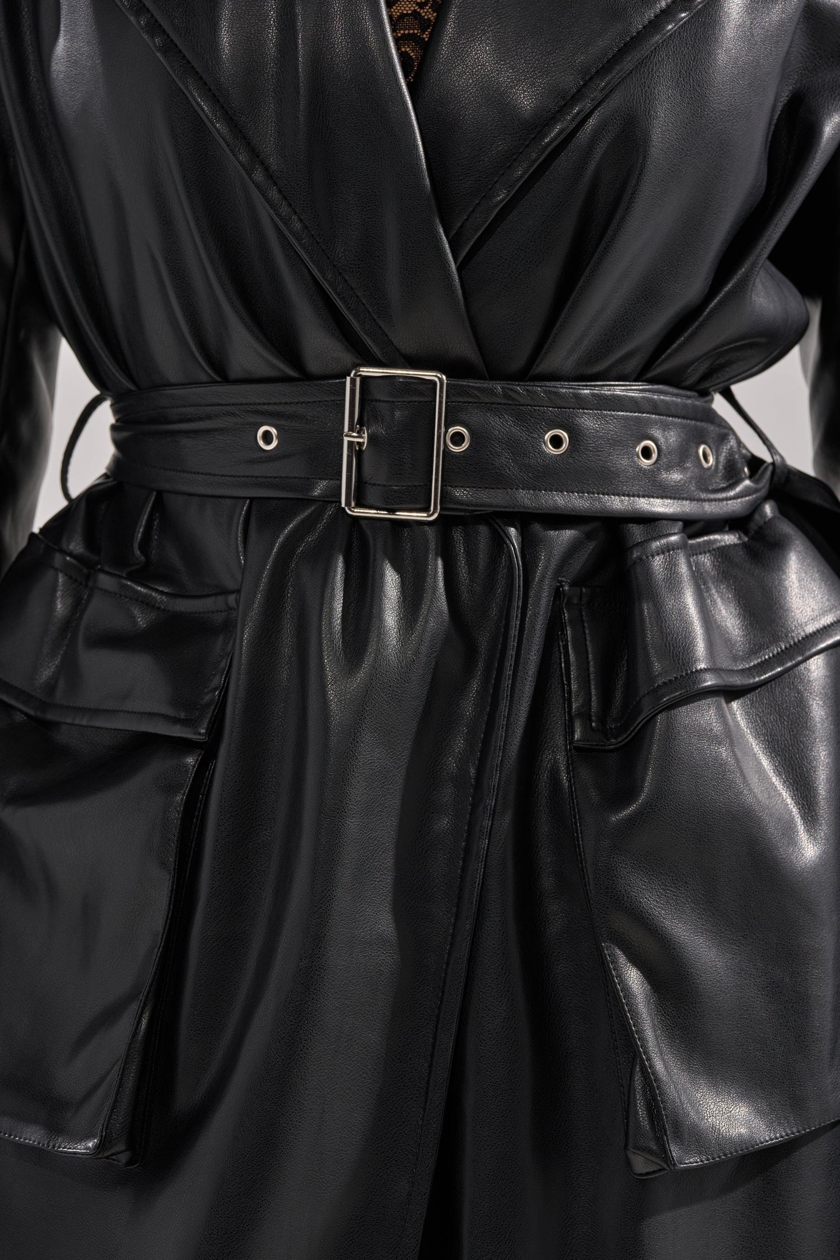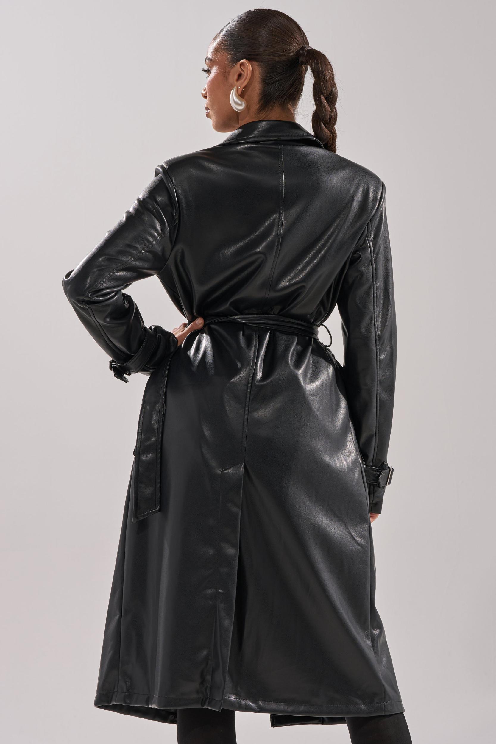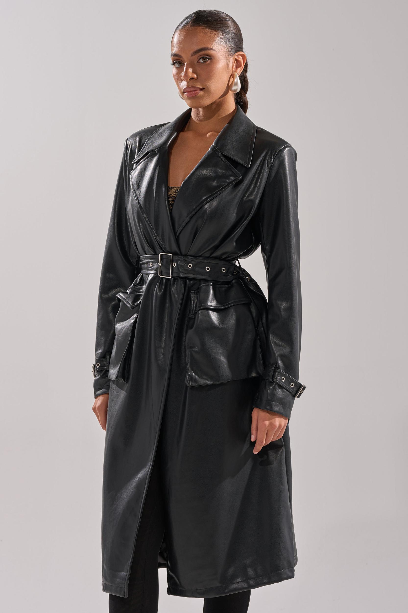 The AKIRA Label Montanna Butter Luxe Everyday Trench is where elevated minimalism meets timeless edge. Crafted from buttery vegan leather, this statement trench features a structured notched lapel, lightly padded shoulders, long sleeves with belted cuffs, utility-inspired waist pockets, concealed button front closures, a back vent slit, and a sleek inner lining. Complete with a sleek, elegant longline silhouette. Perfect for transitional seasons, this coat layers effortlessly over fitted knits, dresses, or denim. - Fabric: 60% PU 40% Polyester - Spot Clean Only- Little Stretch- Imported (all measurements approximate from size small)- 45” Shoulder to Hem- 15” Shoulder to Shoulder- 24” SleevesProduct ID: 1066266 (all measurements approximate from size 1X)- 47” Shoulder to Hem- 17” Shoulder to Shoulder- 26” SleevesProduct ID: 1066270