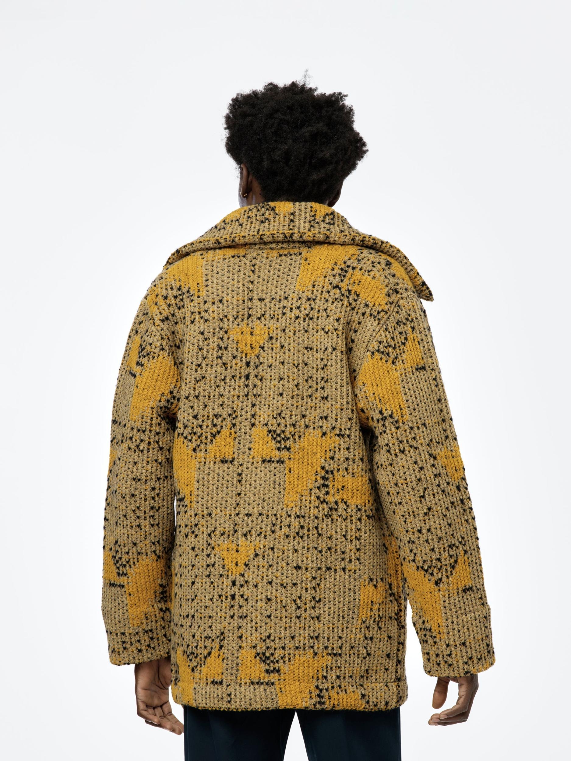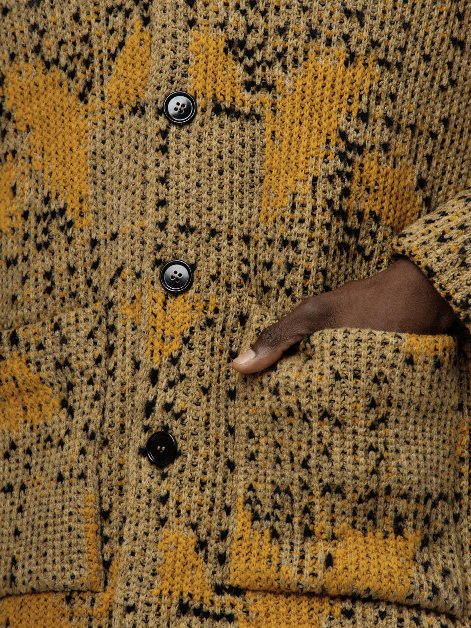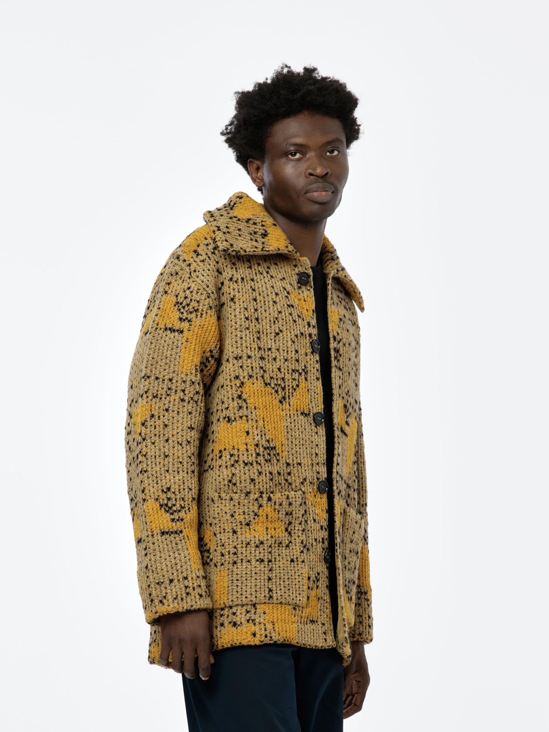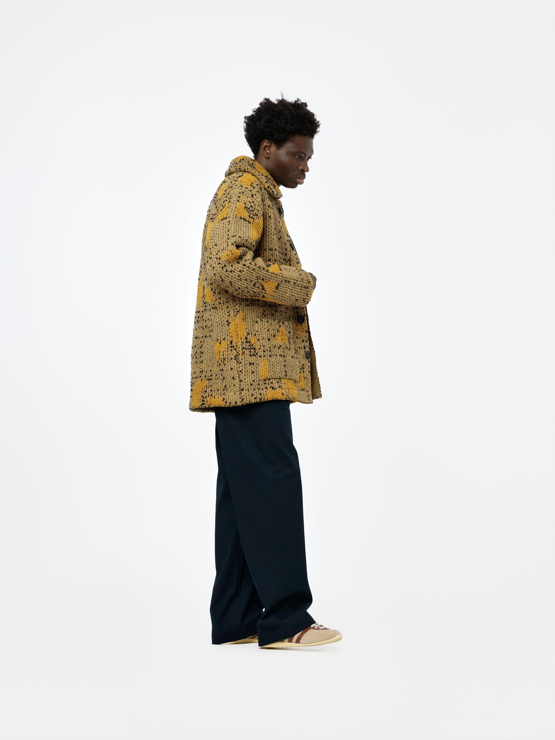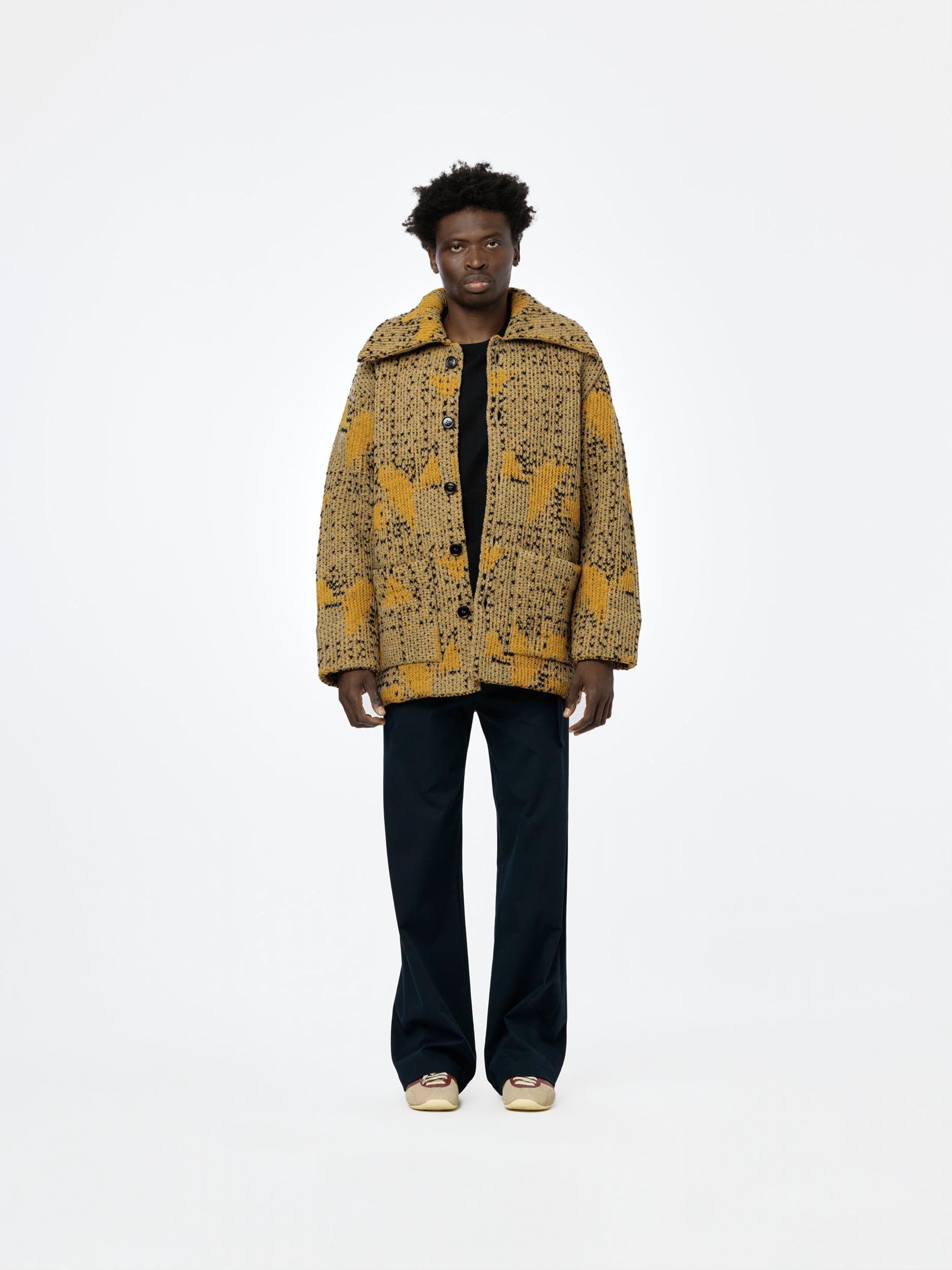 This knit cardigan is crafted from a luxurious blend of merino wool and alpaca, offering both warmth and softness. Featuring an intricate jacquard graphic pattern throughout, it brings a touch of artistry to your wardrobe. The design is finished with a spread collar, button closure, and practical patch pockets, all complemented by relaxed dropped shoulders for a comfortable, laid-back fit. This cardigan effortlessly combines style and functionality, making it a versatile piece for any season.