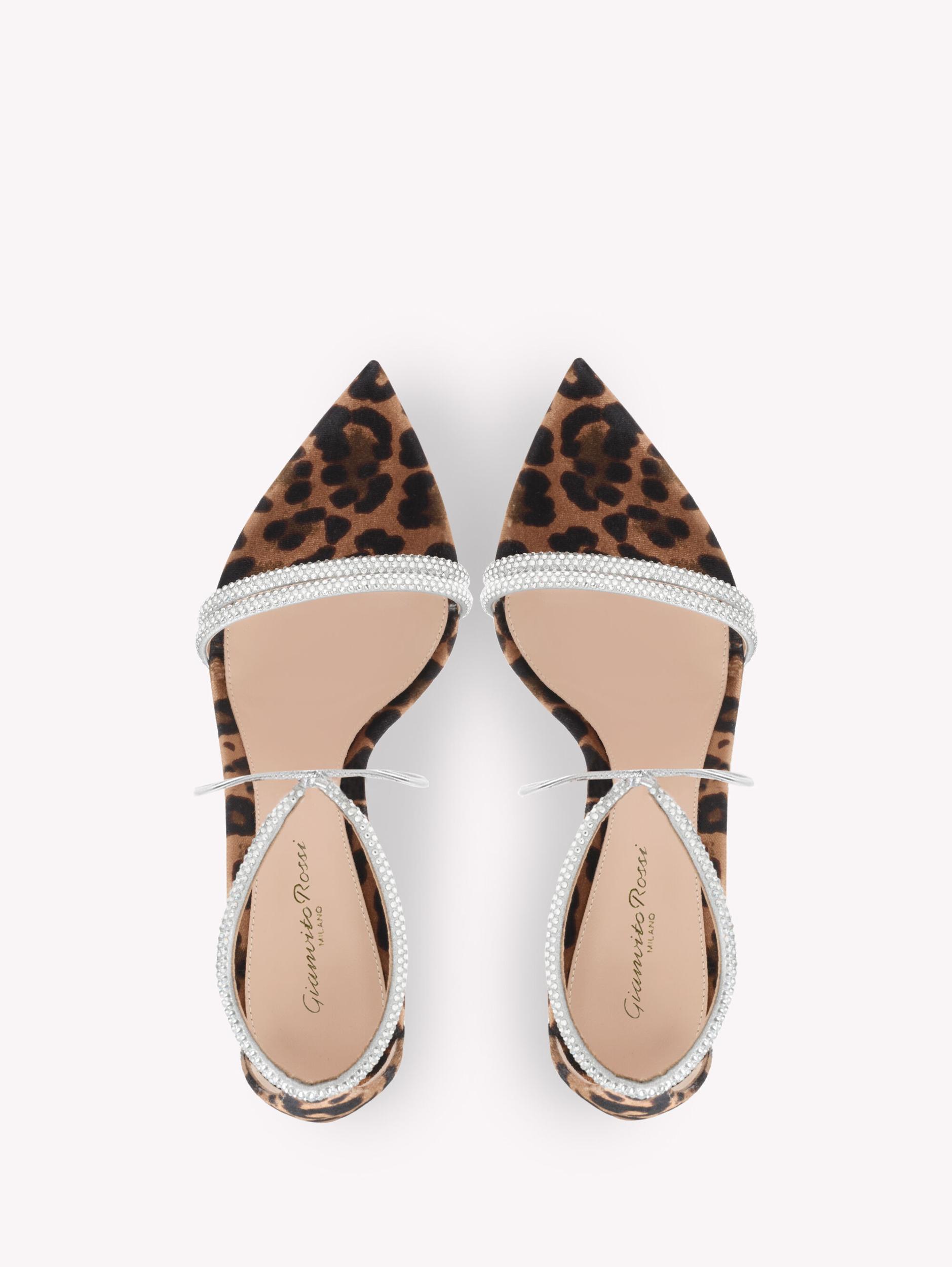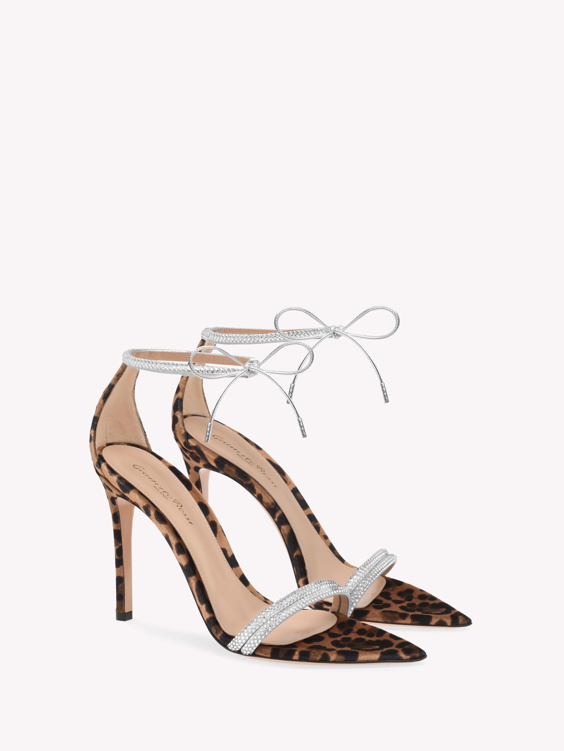 Montecarlo is a pointed-toe sandal, set on an elegant 105mm stiletto heel. Two thin straps embellish the front with tiny precious crystals. The ankle strap shines as well: tiny crystals enrich the bow tie detailed ankle strap. Handcrafted in Italy as in the best artisanal tradition.